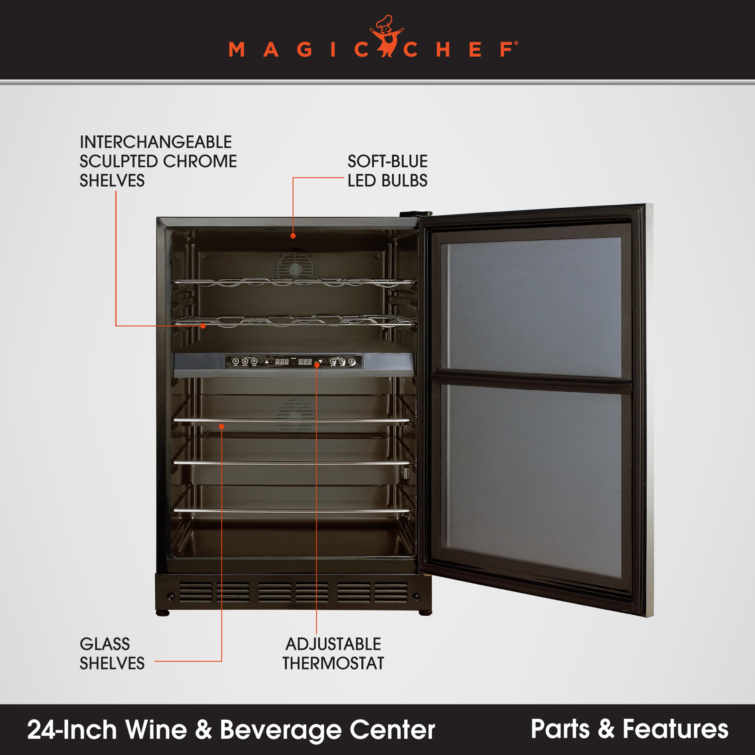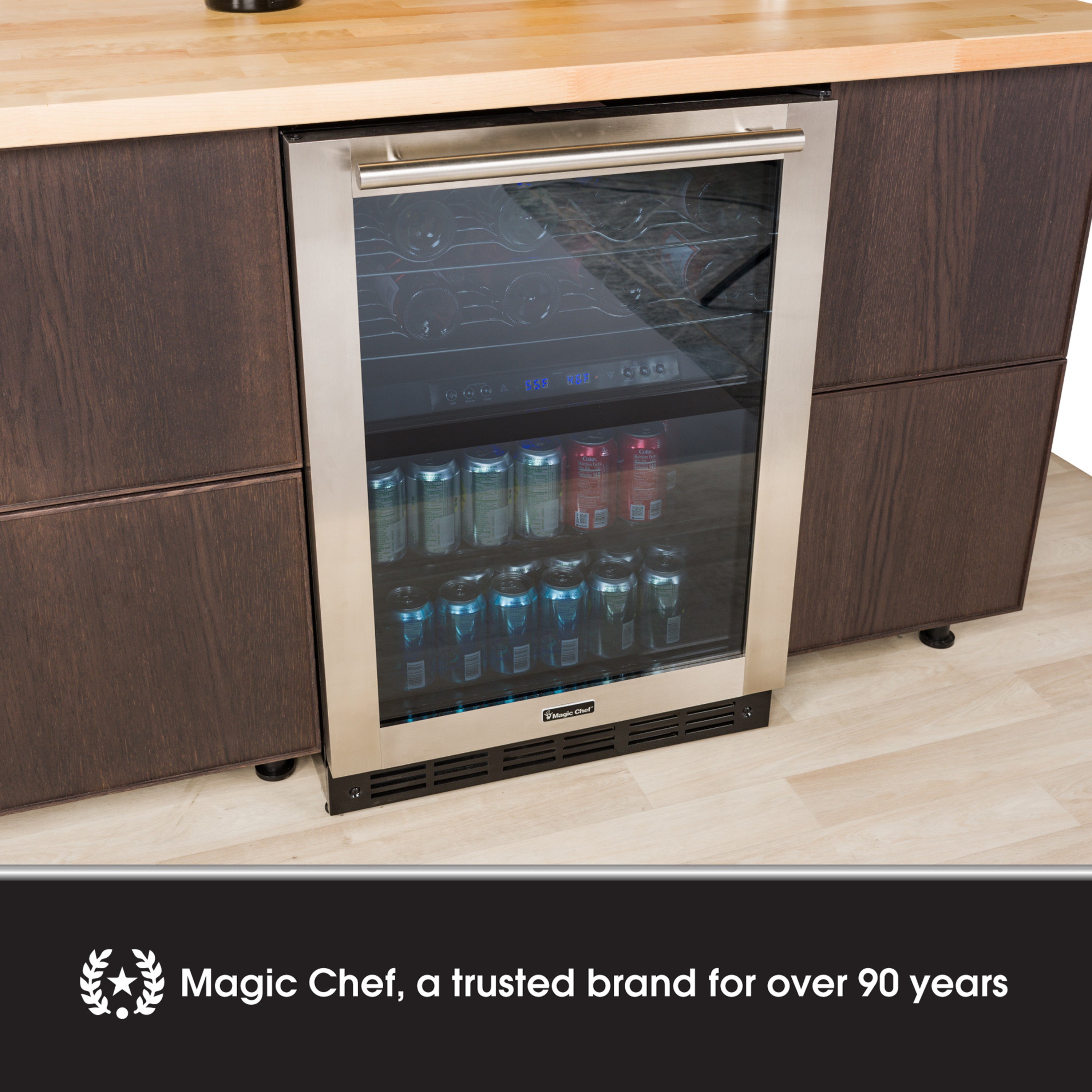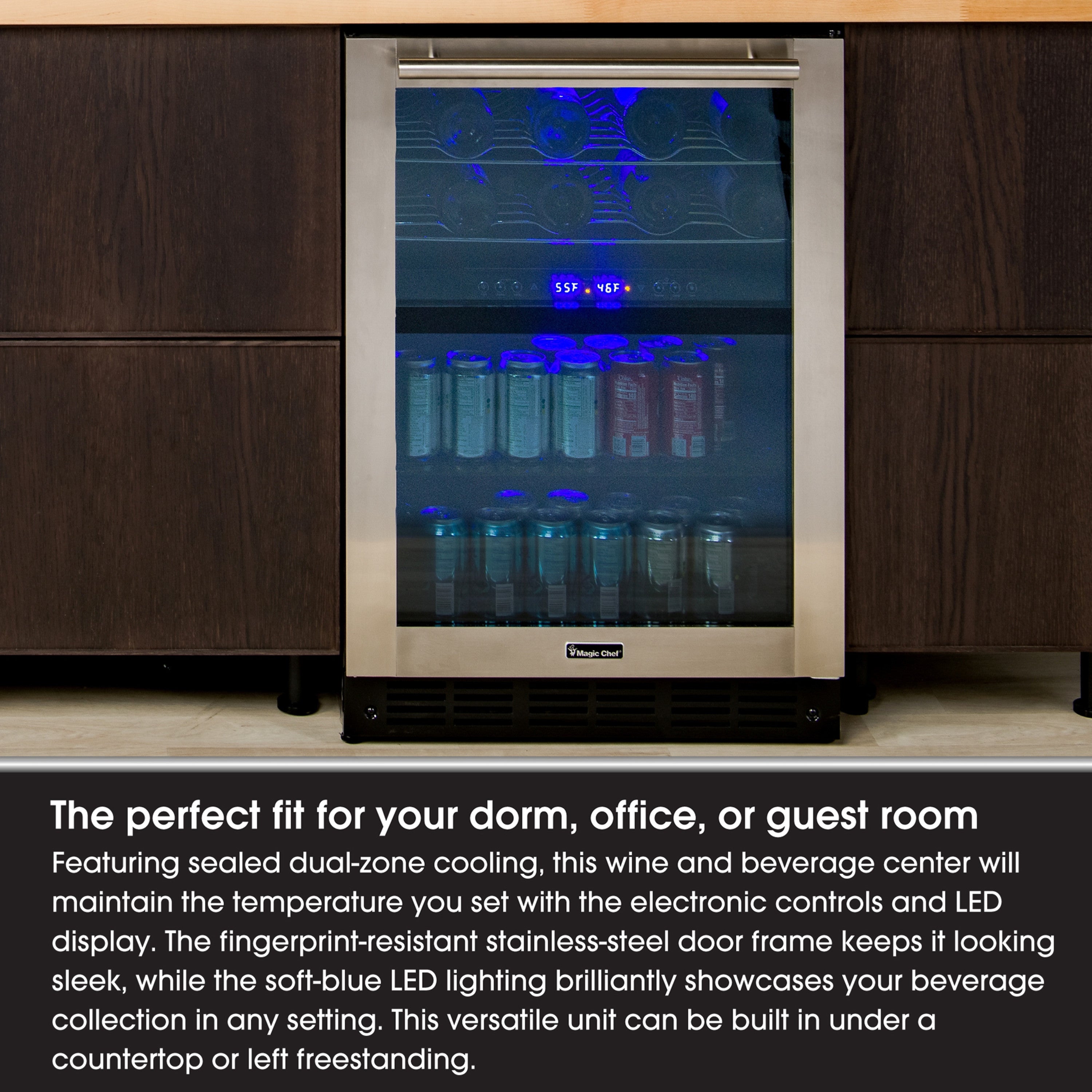 Store your favorite beverages in this Magic Chef Wine and Beverage Cooler. Sealed dual-zone cooling maintains the temperature you set using the electronic controls with LED display. This sleek cooler will look great anywhere with a fingerprint resistant stainless steel door frame and soft blue LED stage lighting to brilliantly showcase your beverage collection. This unit can be built-in under a countertop or freestanding.