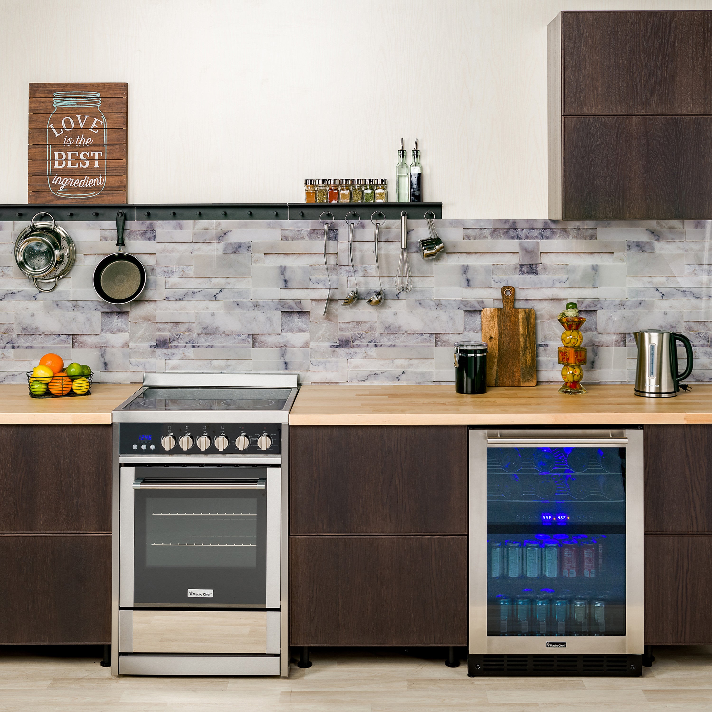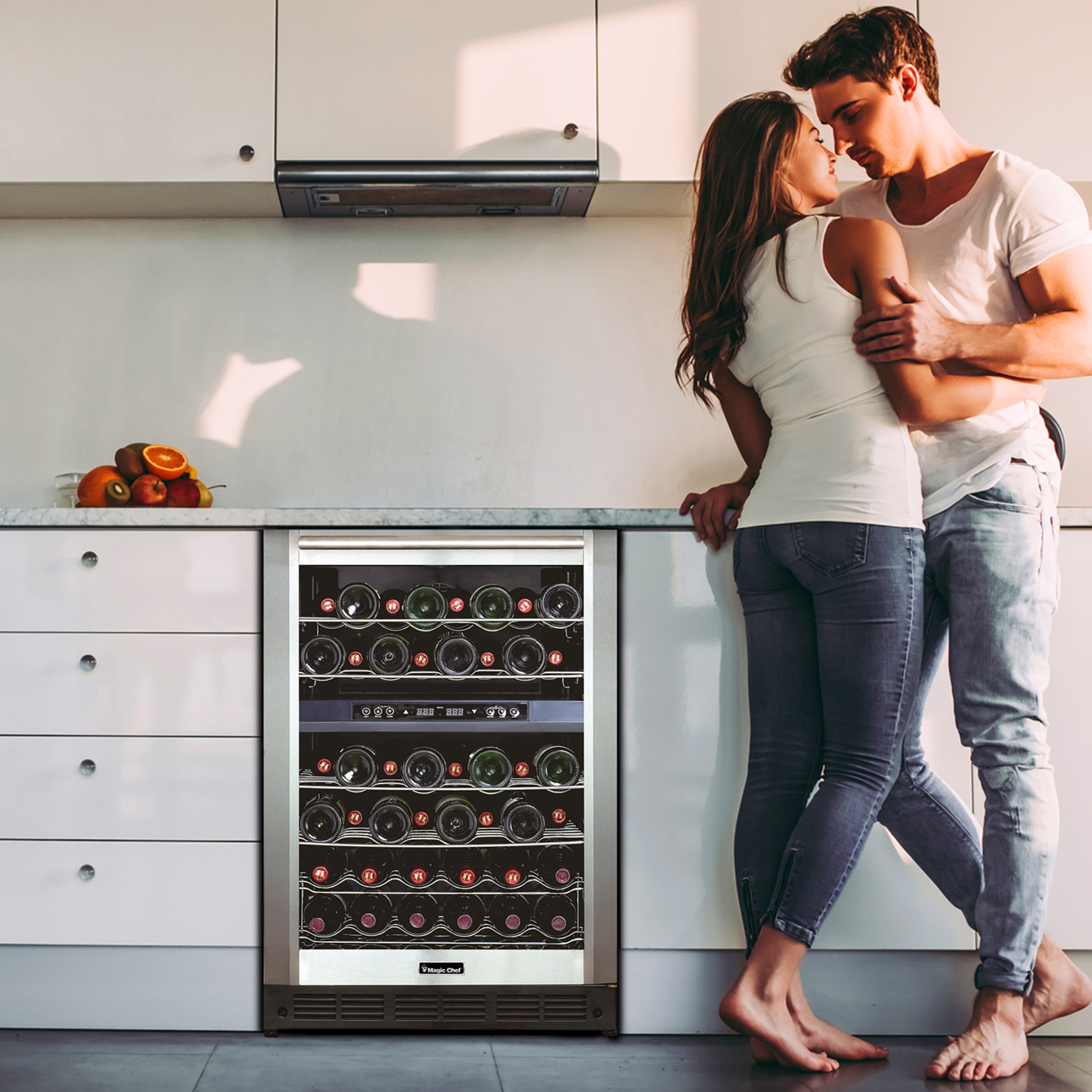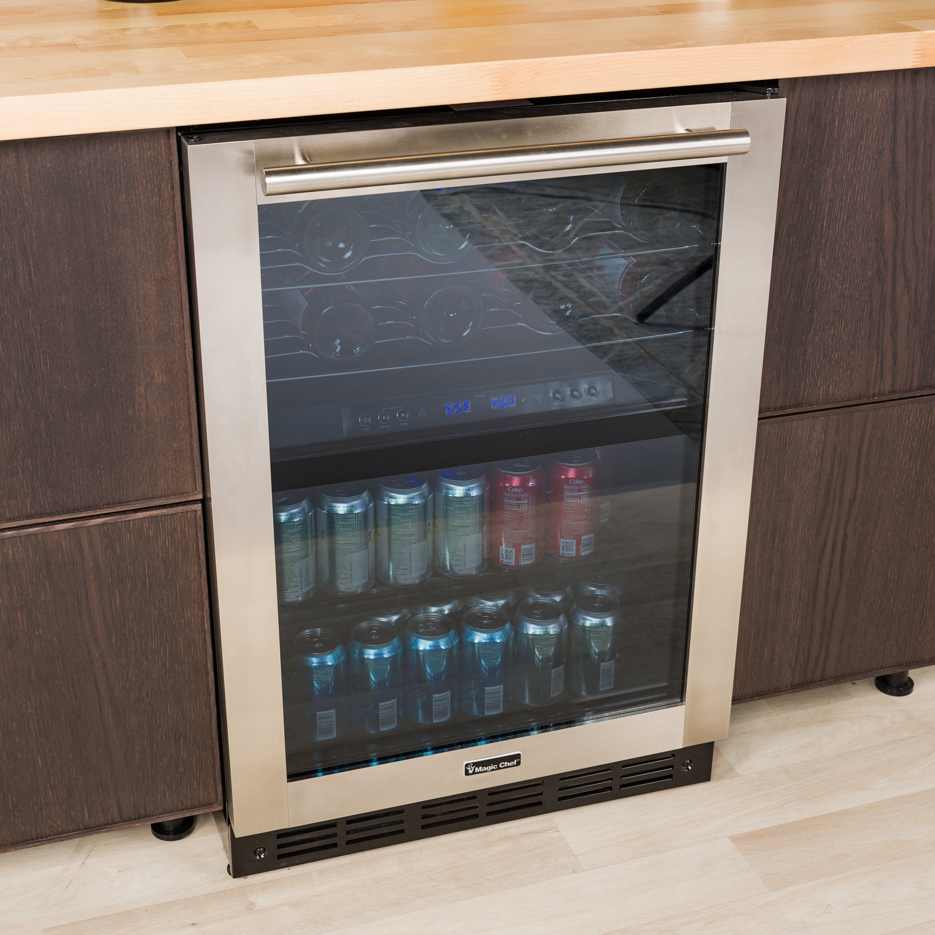 Store your favorite beverages in this Magic Chef Wine and Beverage Cooler. Sealed dual-zone cooling maintains the temperature you set using the electronic controls with LED display. This sleek cooler will look great anywhere with a fingerprint resistant stainless steel door frame and soft blue LED stage lighting to brilliantly showcase your beverage collection. This unit can be built-in under a countertop or freestanding.