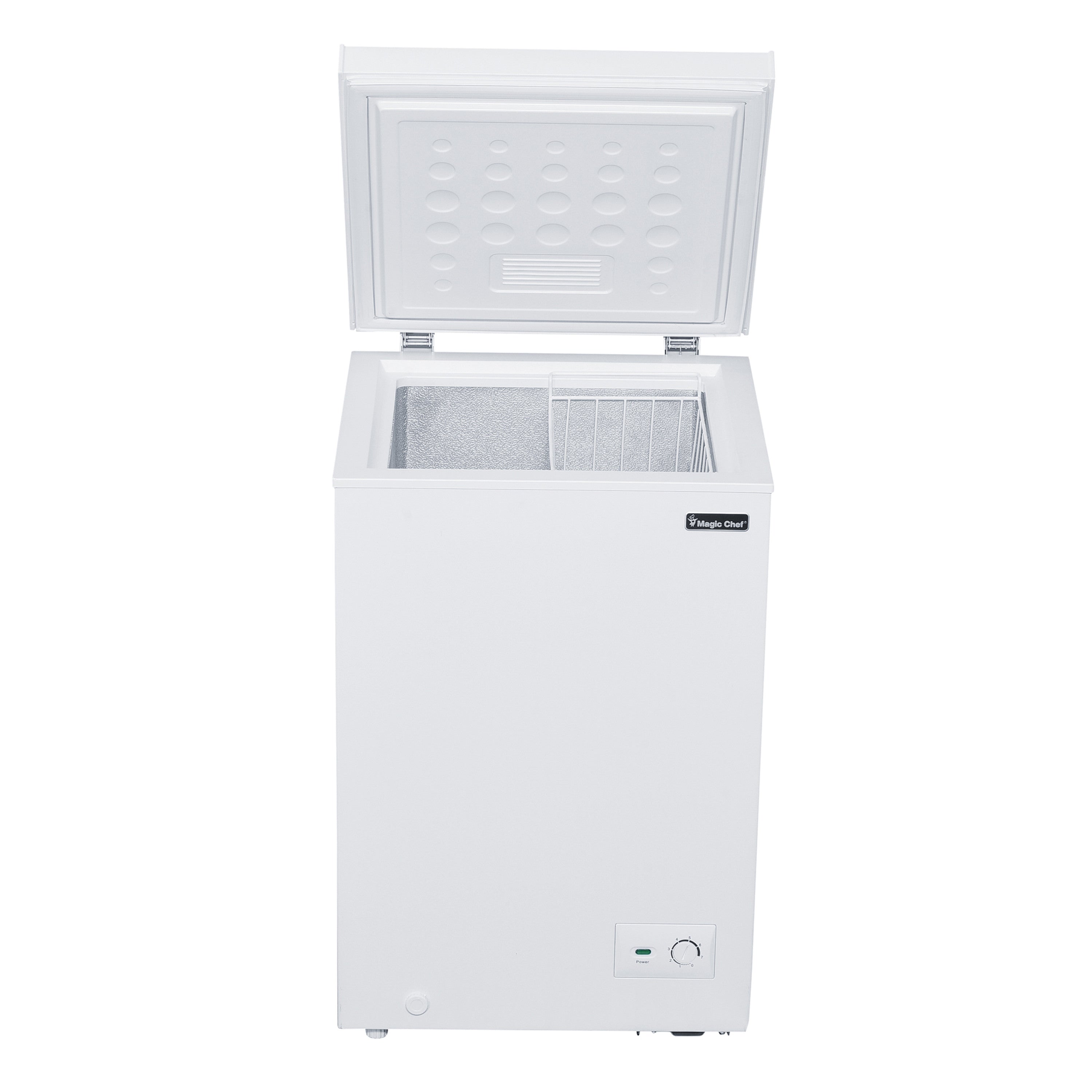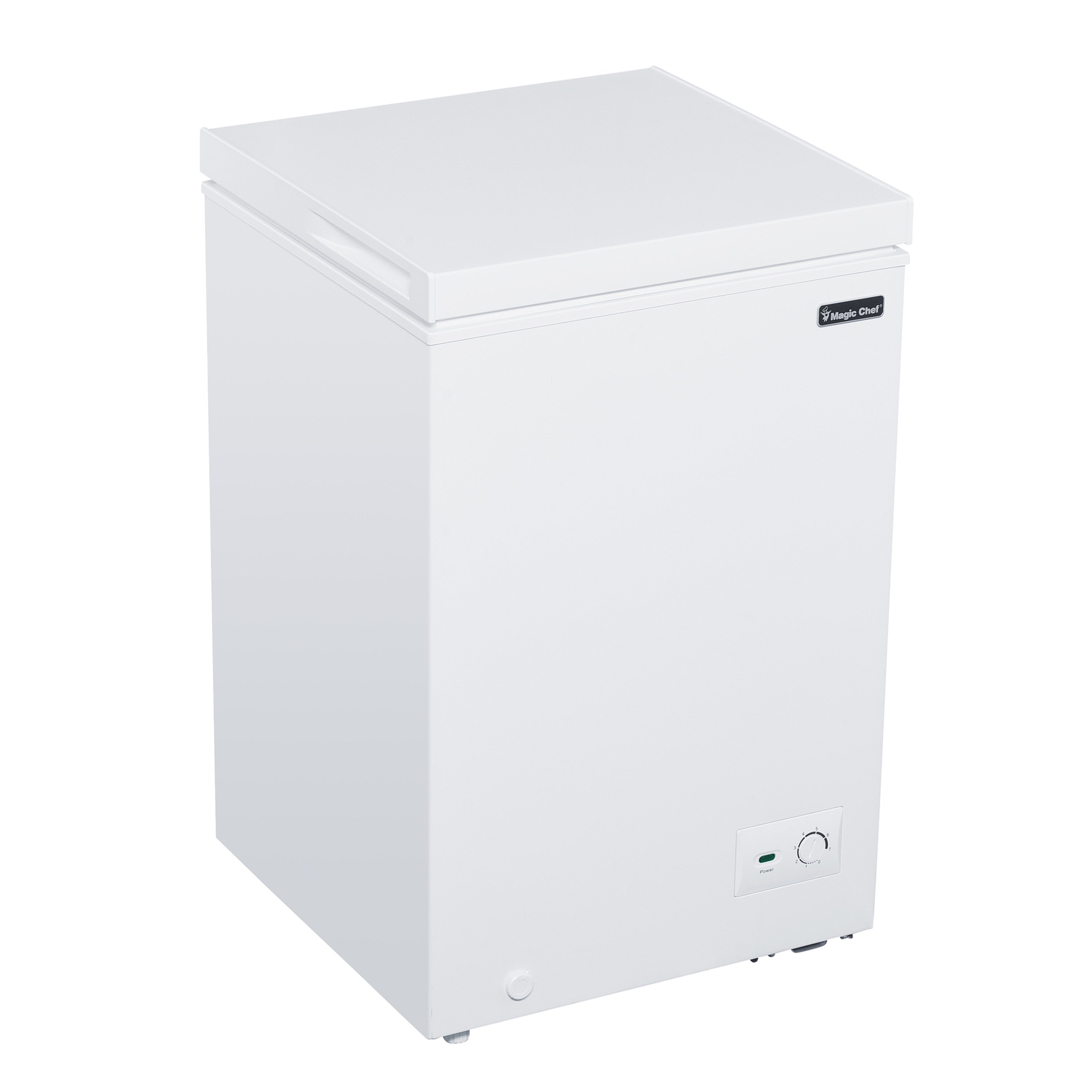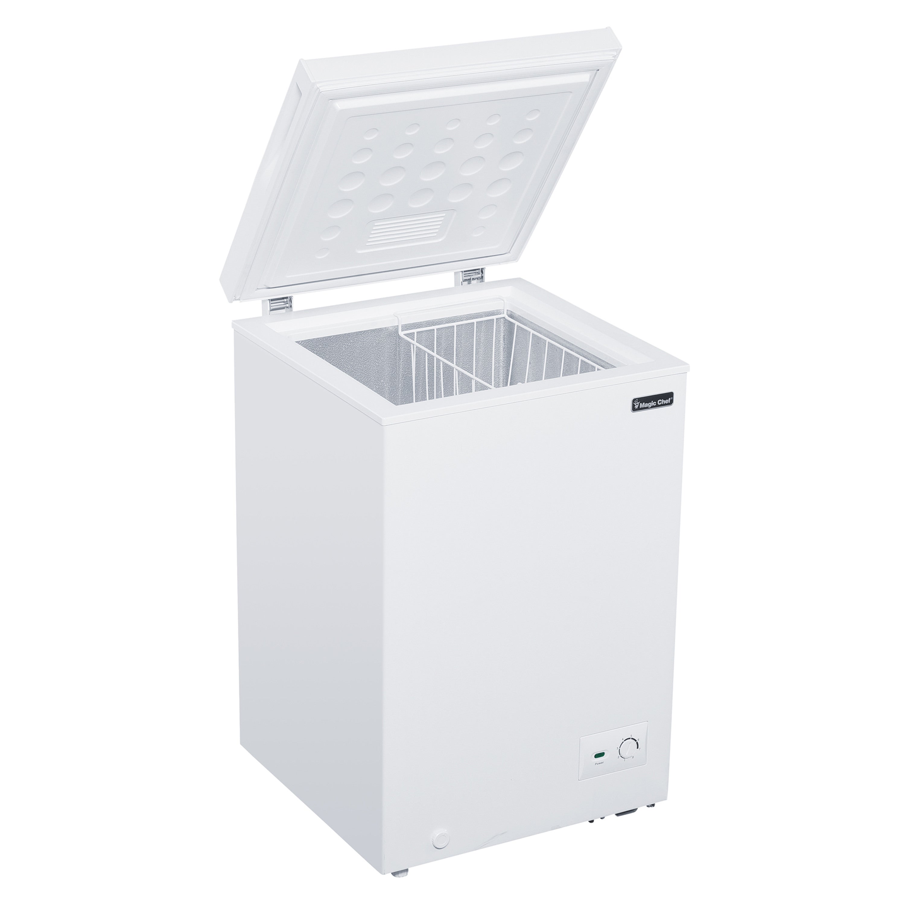 The Magic Chef 3.5 cu. ft. chest freezer will let you stock up on all your extra favorite frozen foods. It offers installation flexibility and provides extra storage for food in a compact space. Freezer should ideally be placed in areas where the ambient temperature ranges from 32°F to 100°F. for efficient operation. The external temperature control makes it easy and efficient to operate because you can make temperature adjustments without opening the lid. The sliding basket makes it easier to organize and access your frozen items. Recessed handle adds to its premium and sleek design.