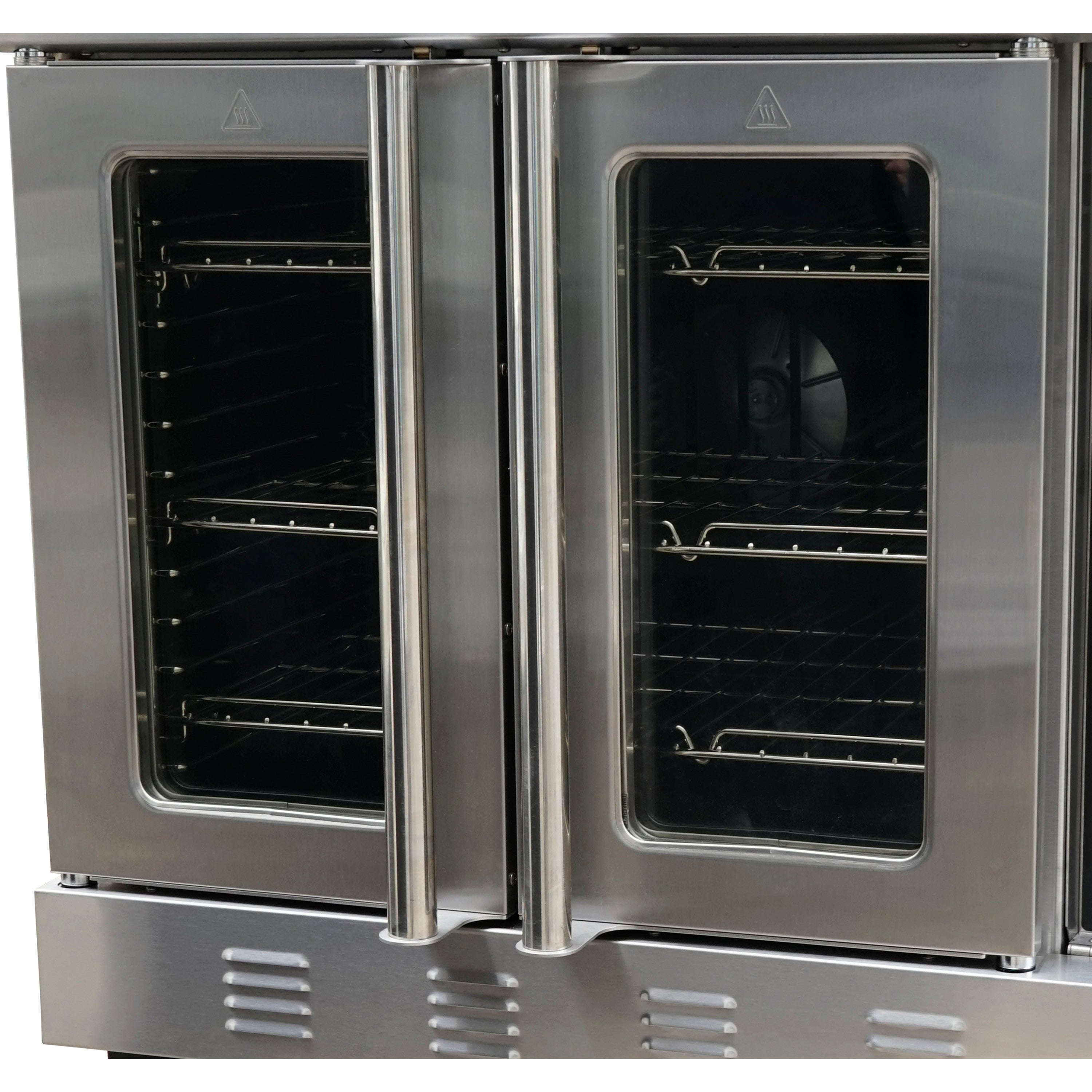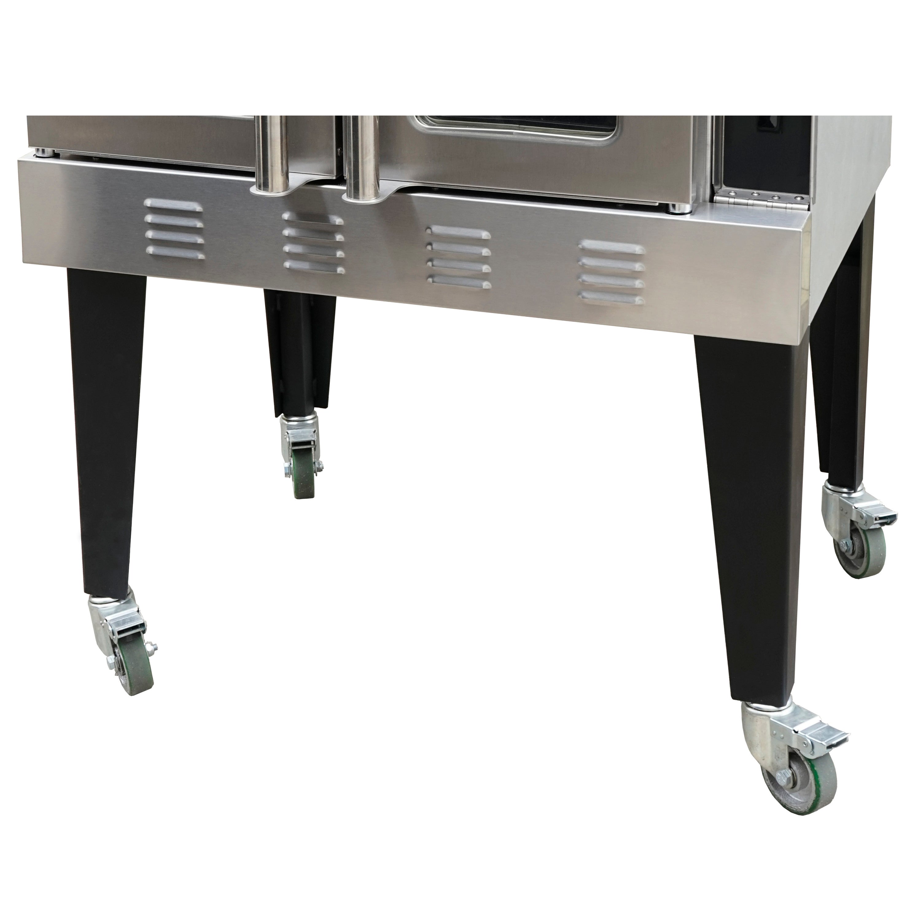 The Magic Chef Commercial 38 in. gas convection oven is designed to thoroughly cook foods. The commercial convection oven will evenly cook all your restaurant/food service items. Cooking temperatures range from a low of 167° to a high of 563° to efficiently meet cooking needs. There are 4 heavy duty chrome-plated racks. 60-minute timer to conveniently alert the cook. Interior light provides easy viewing; and its porcelain interior is easy to clean.