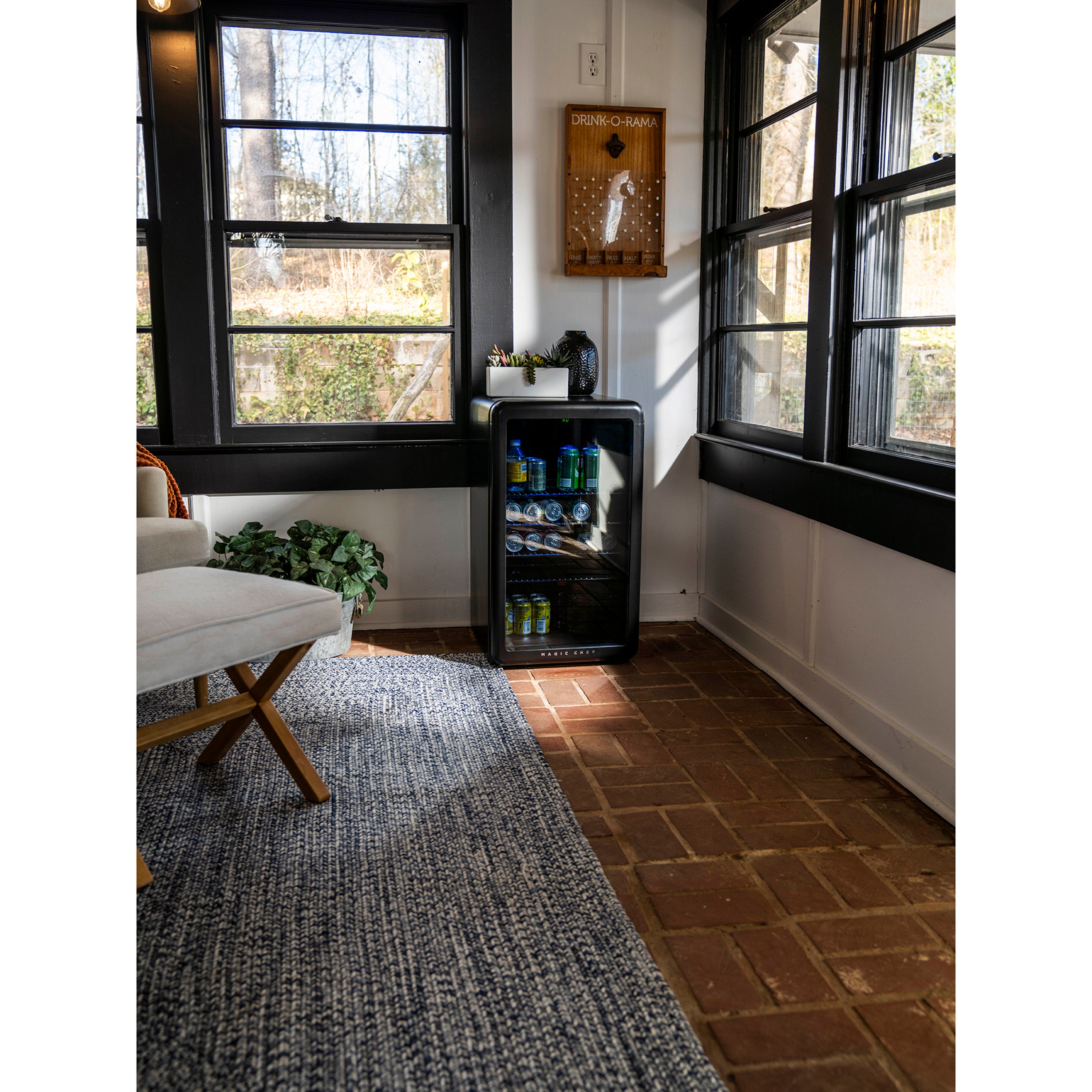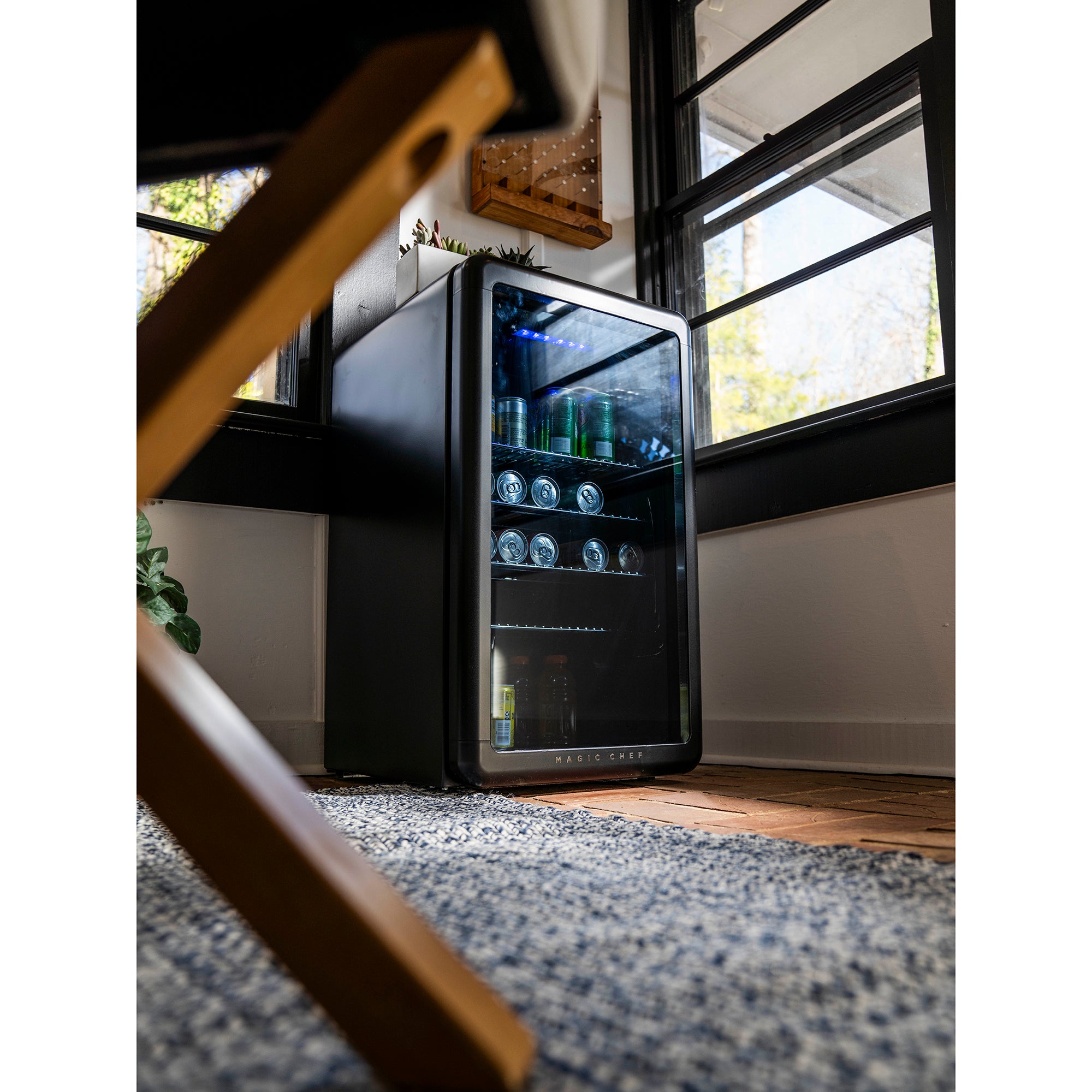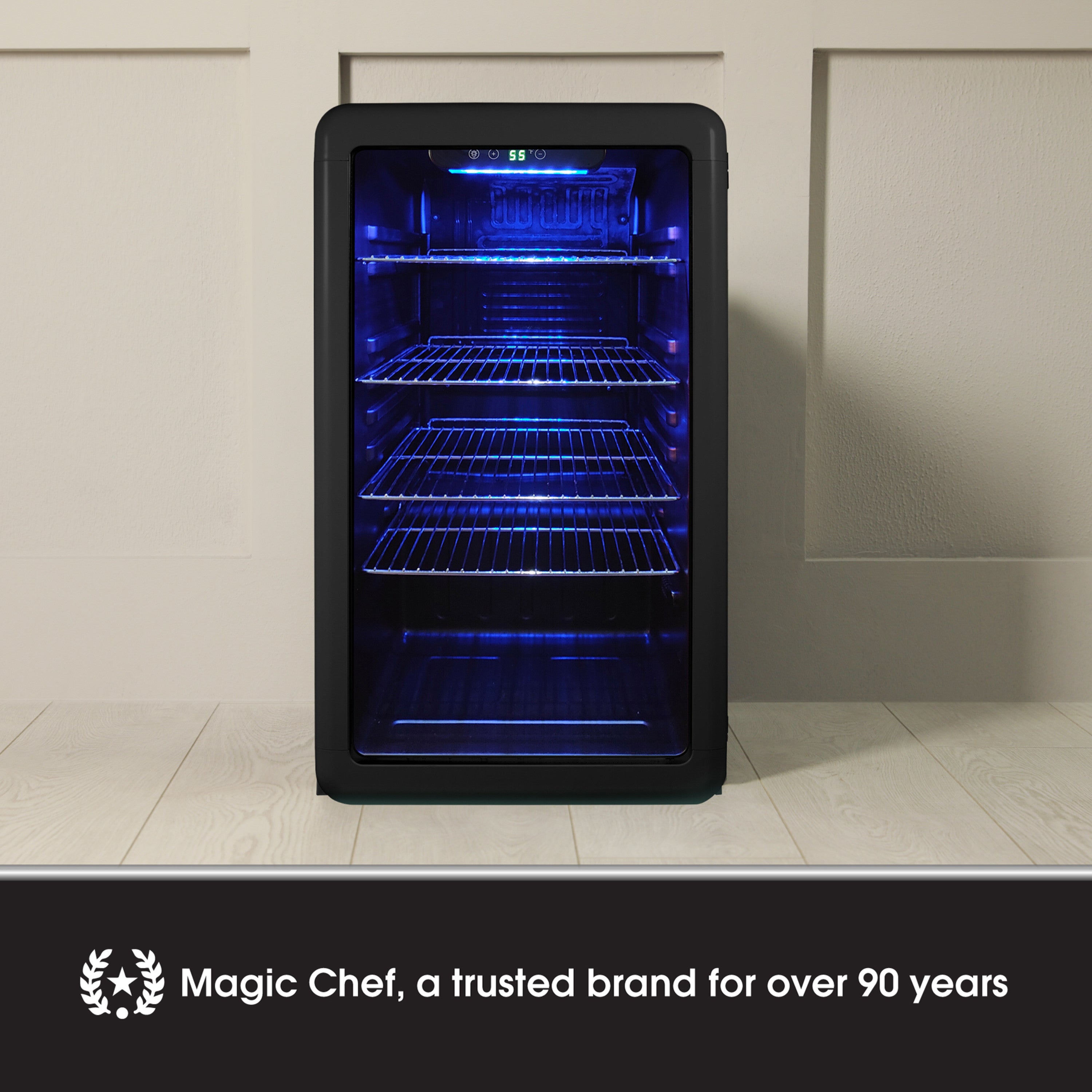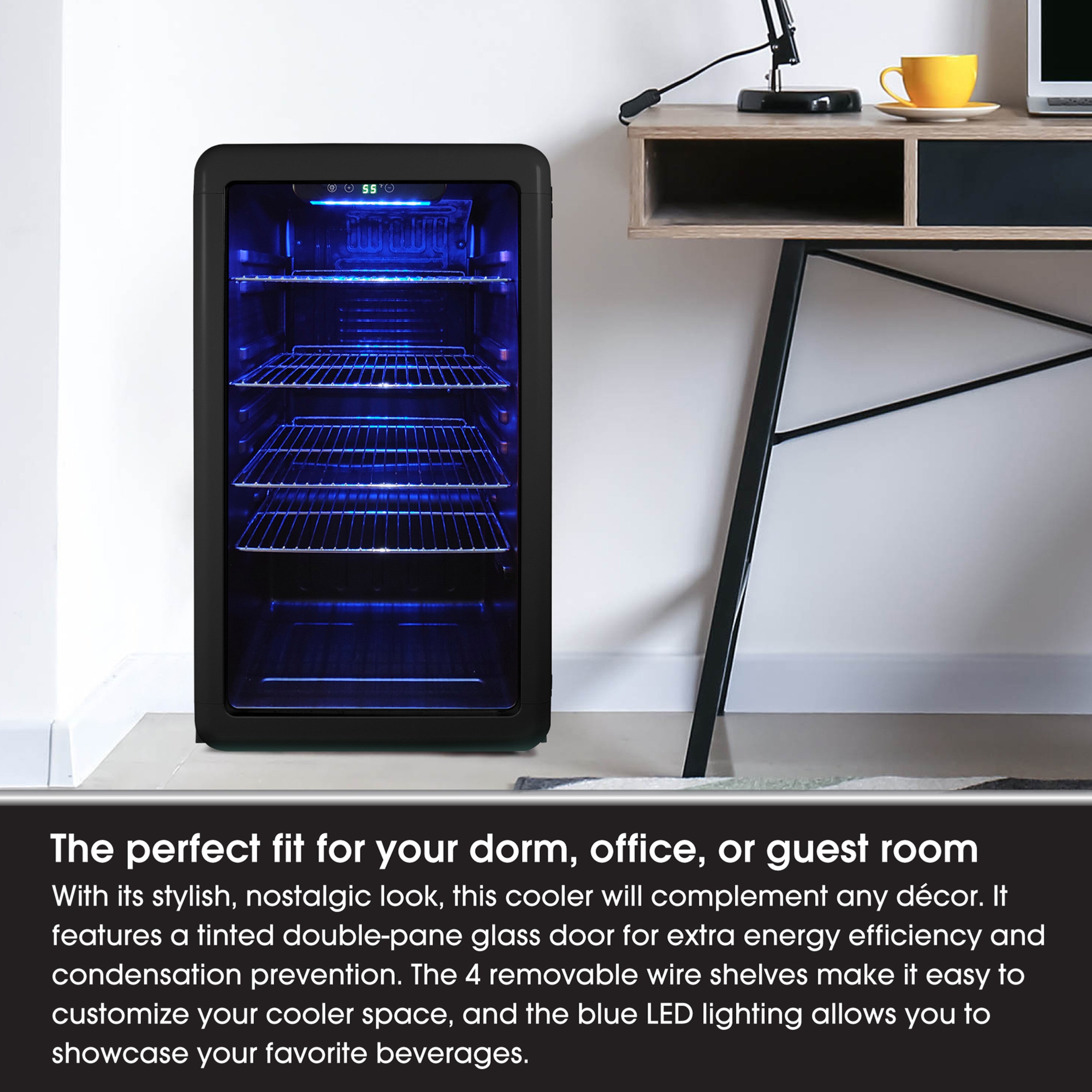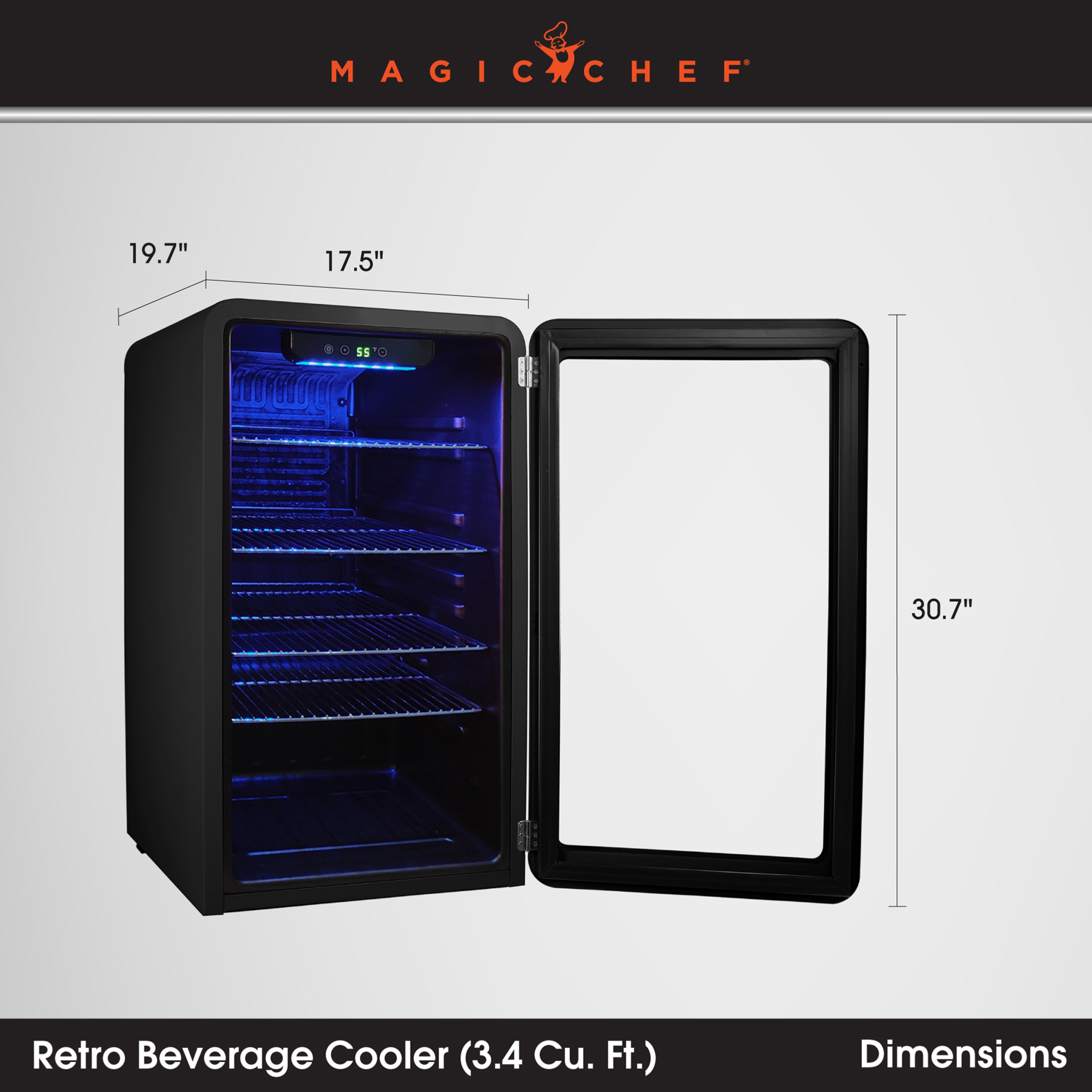 The Magic Chef 3.4 cu. ft. Retro Beverage Cooler in black will be the perfect addition to any dorm, office or rec room. The stylish nostalgic look will complement any décor. The LED blue lighting showcases your beverages. The tinted double pane glass door is more energy efficient than single pane glass and helps prevent condensation. There are 4 removable wire shelves which can be adjusted according to your beverages. This beverage cooler offers a 1-year parts and labor warranty and 5-year compressor part warranty.