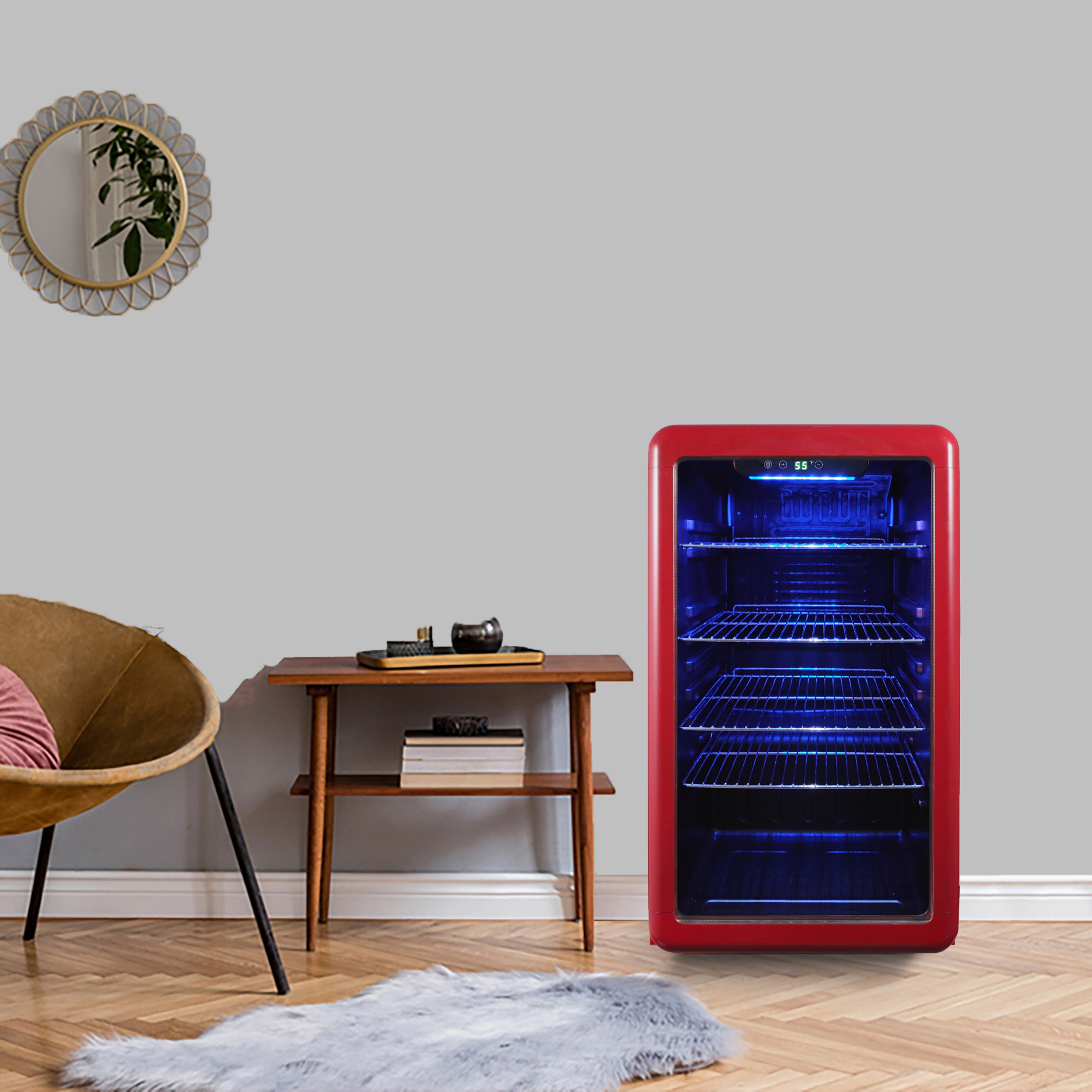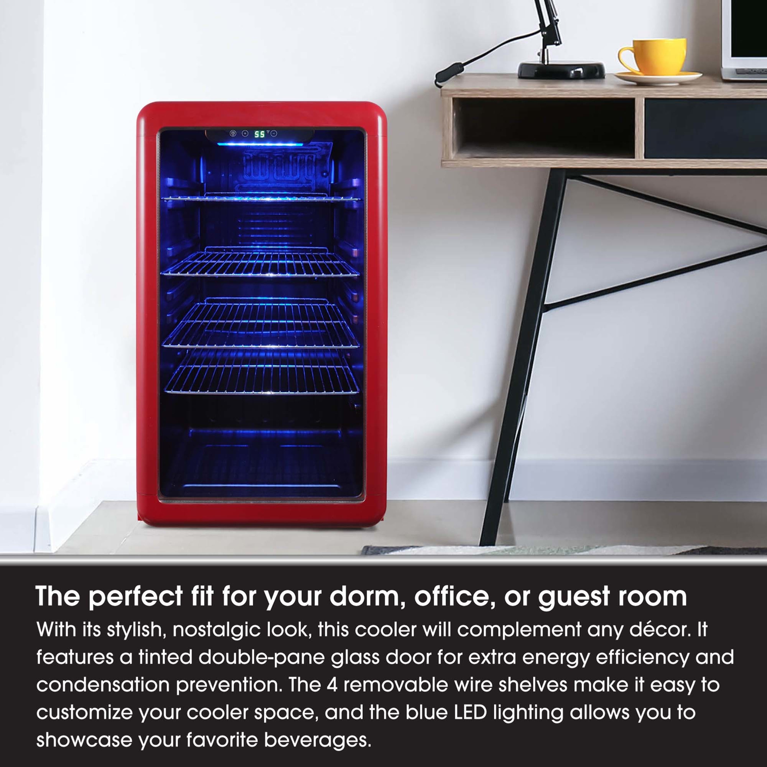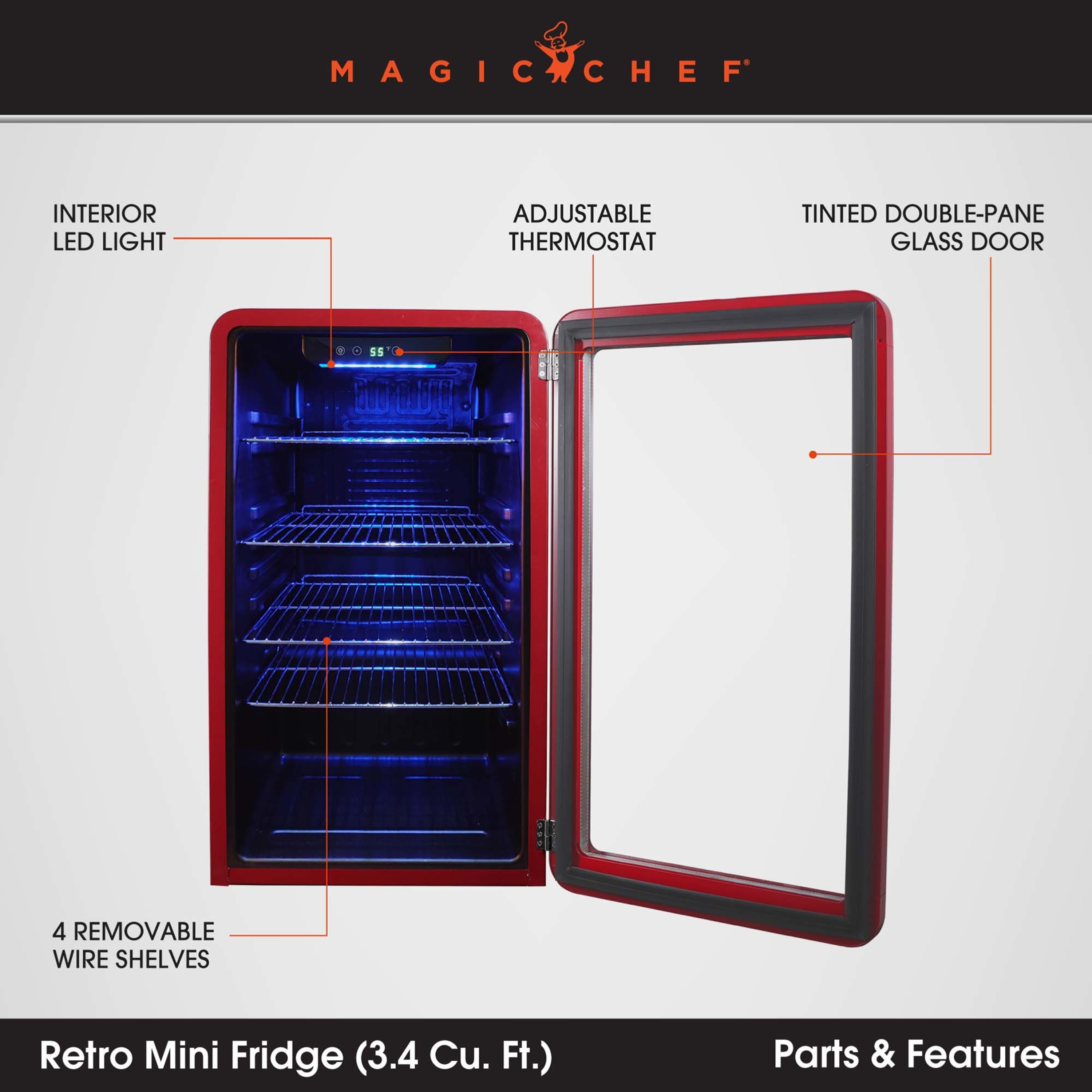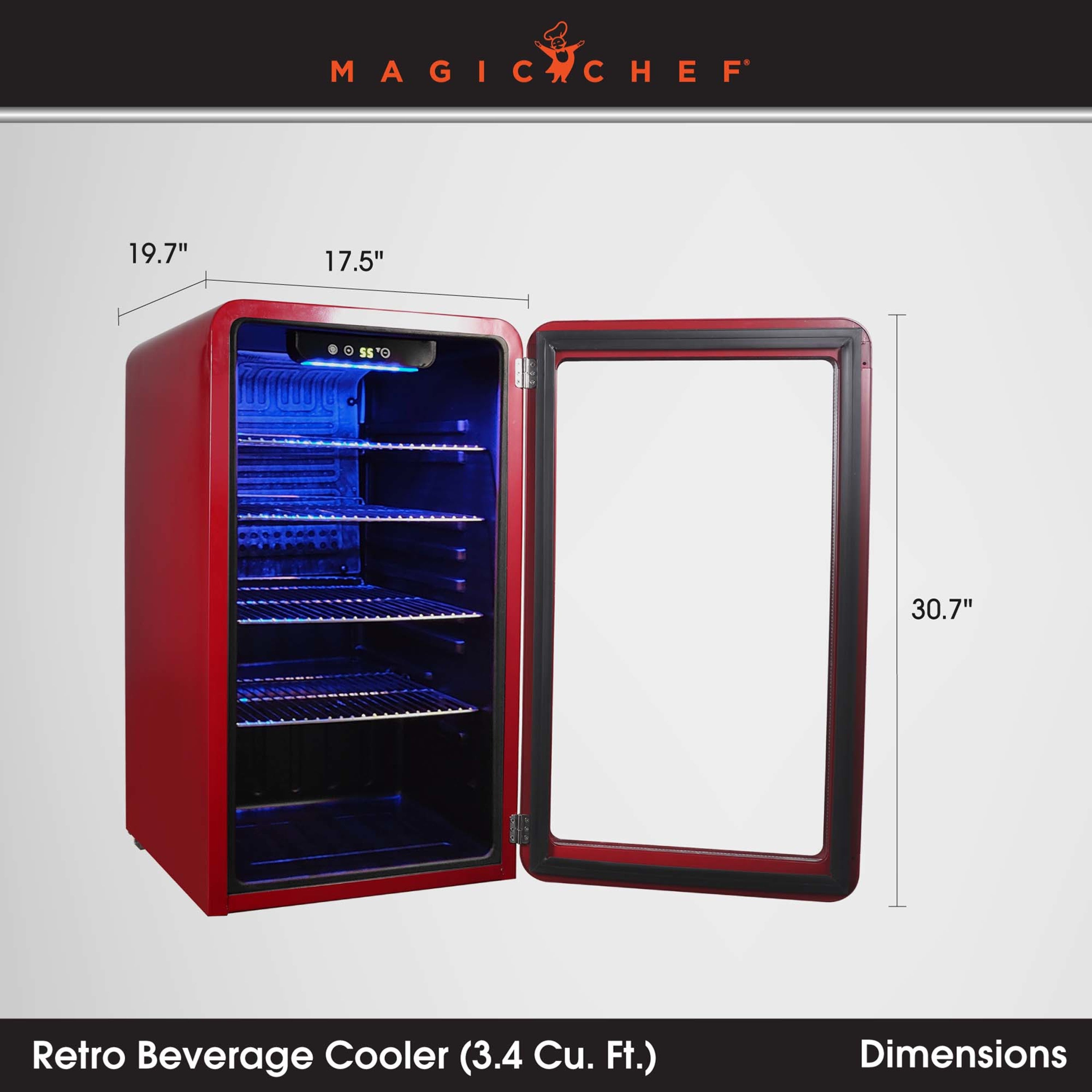 The Magic Chef 3.4 cu. ft. Retro Beverage Cooler in red will be the perfect addition to any dorm, office or rec room. The stylish nostalgic look will complement any décor. The LED blue lighting showcases your beverages. The tinted double pane glass door is more energy efficient than single pane glass and helps prevent condensation. There are 4 removable wire shelves which can be adjusted according to your beverages. This beverage cooler offers a 1-year parts and labor warranty and 5-year compressor part warranty.