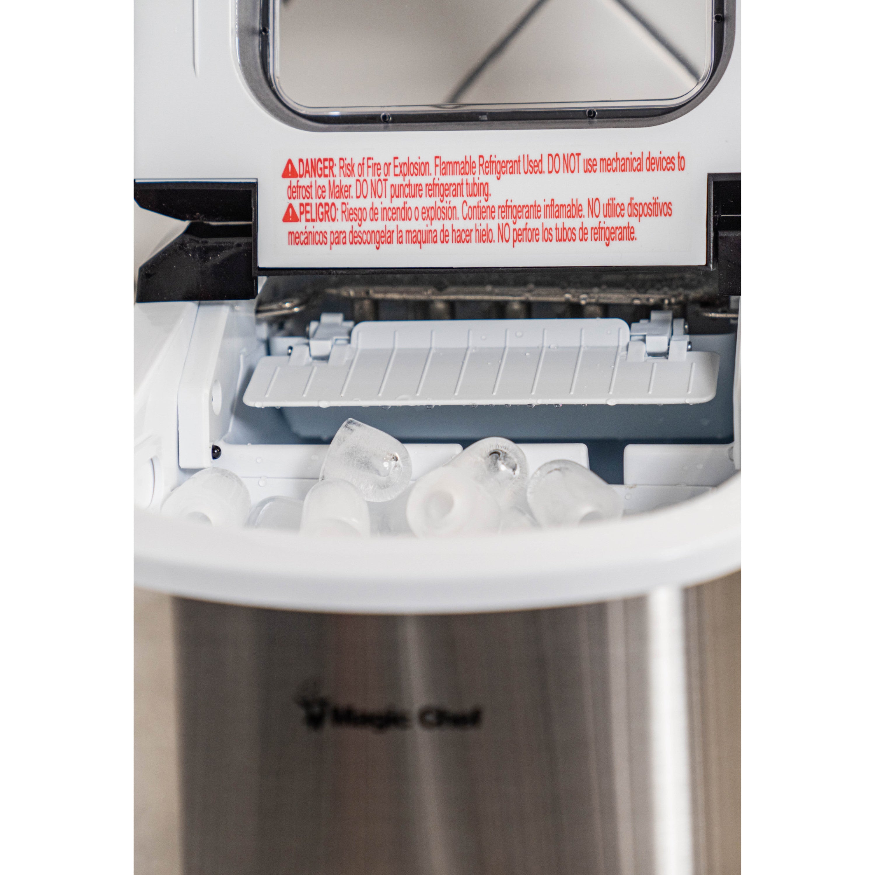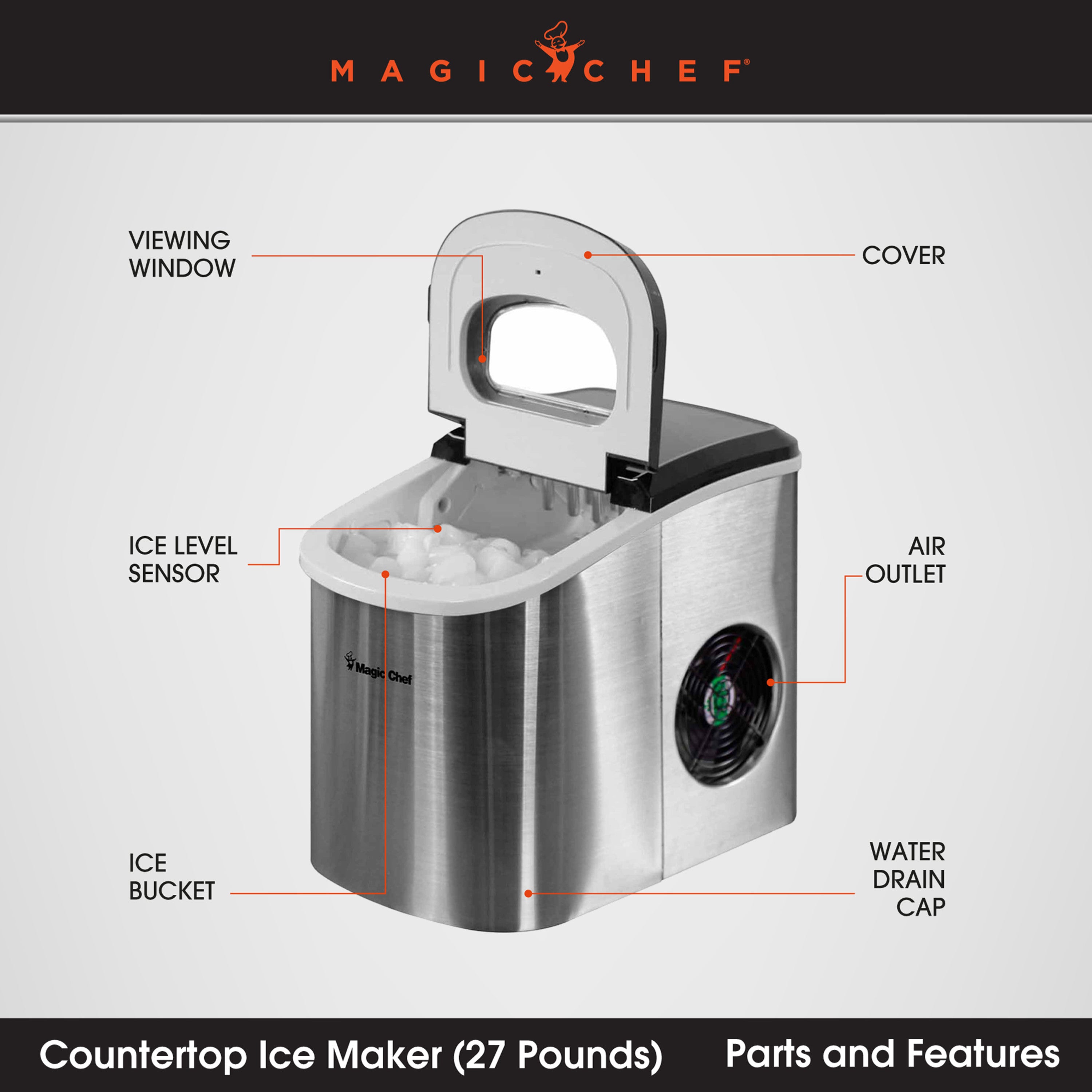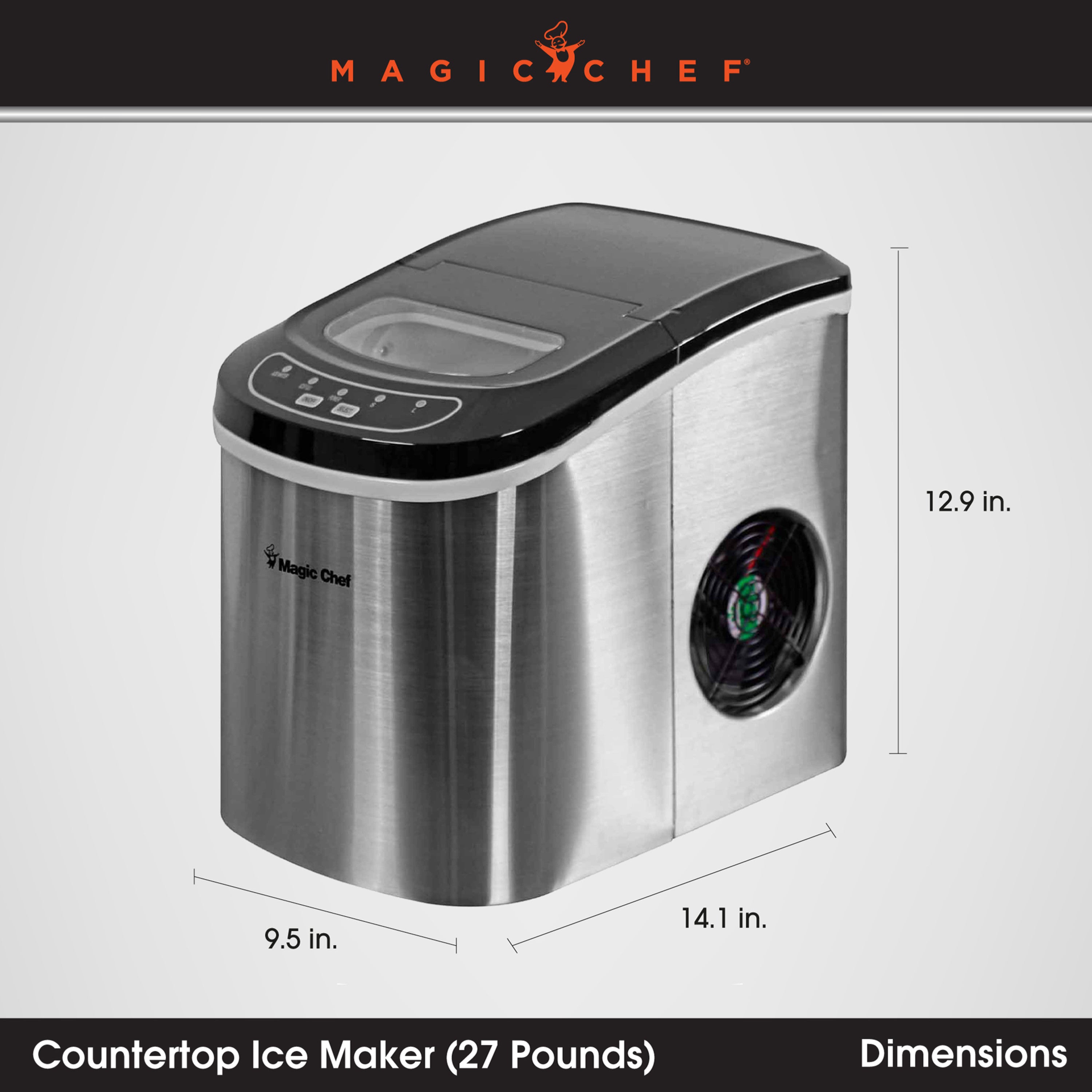 The Magic Chef Countertop Ice Maker can make up to 27 lbs. of ice per day to help provide you with a steady supply of ice. It is just what you need to continuously fill your ice bucket or beverage pitchers when you are entertaining friends and family. Just add water and select the desired size to make ice in as little as 7 minutes.