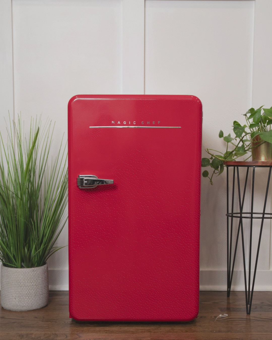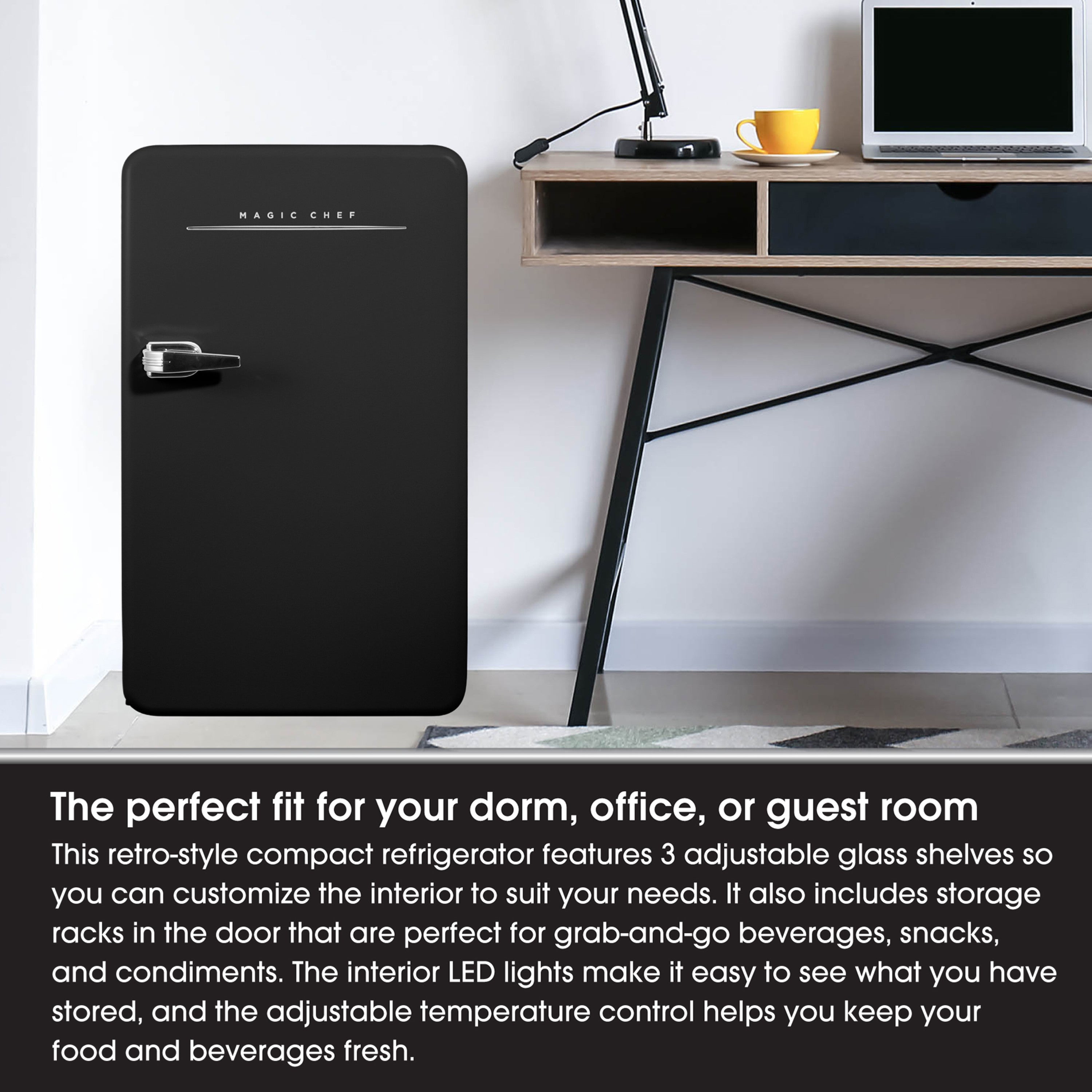 The Magic Chef 3.2 cu. ft. Retro Mini Fridge in black is a stylish addition to any dorm, office, rec room or kitchen. The all-refrigerator design features 3 adjustable glass shelves so you can modify the interior to suite your needs. The in-door storage racks are perfect for grab and go beverages, snacks and condiments and includes a can dispenser. An interior LED lights makes it easy to see what you have and an adjustable temperature control ensures the fridge is the perfect temperature. This compact refrigerator is Energy Star Certified and offers a 1-year parts and labor warranty and 5-year compressor part warranty.