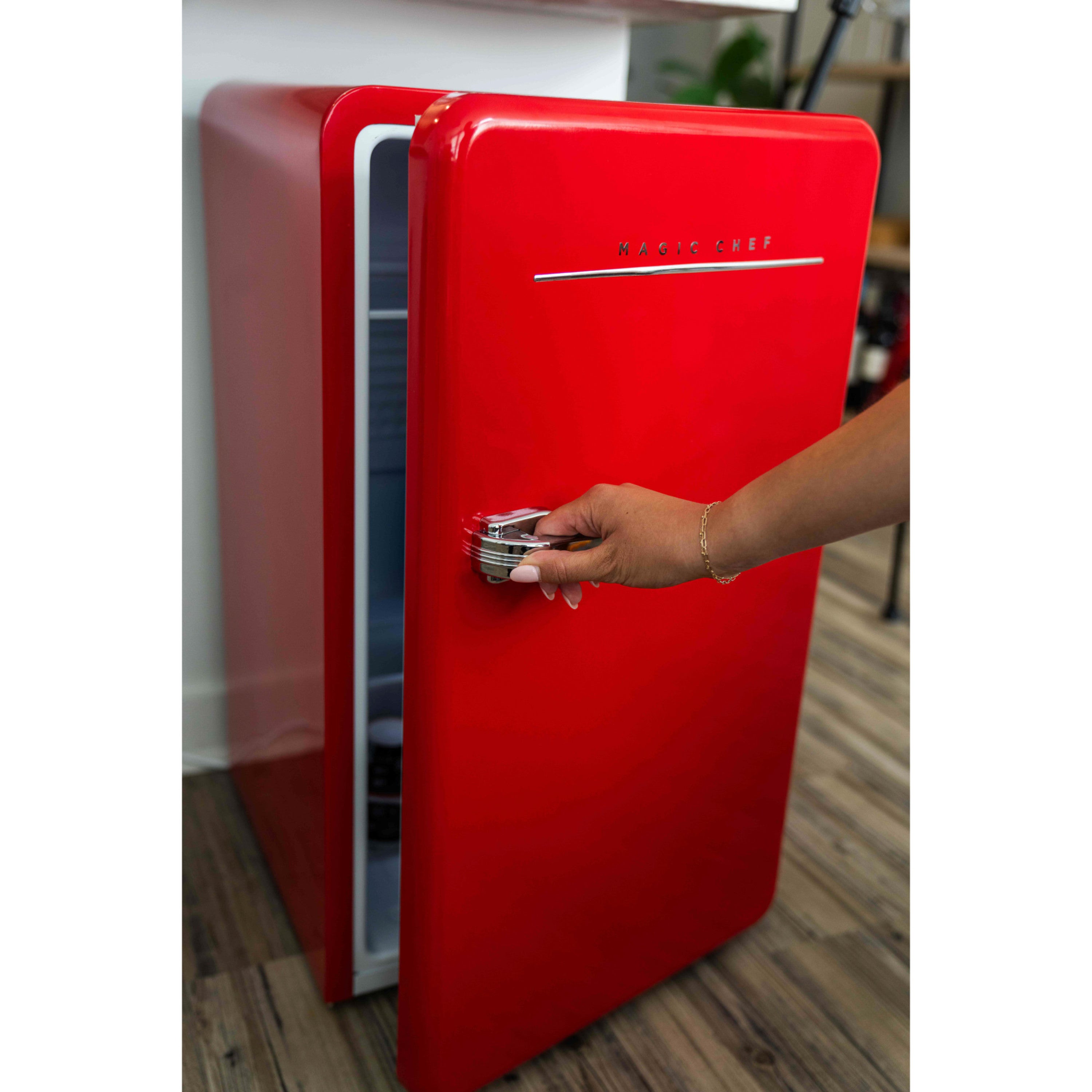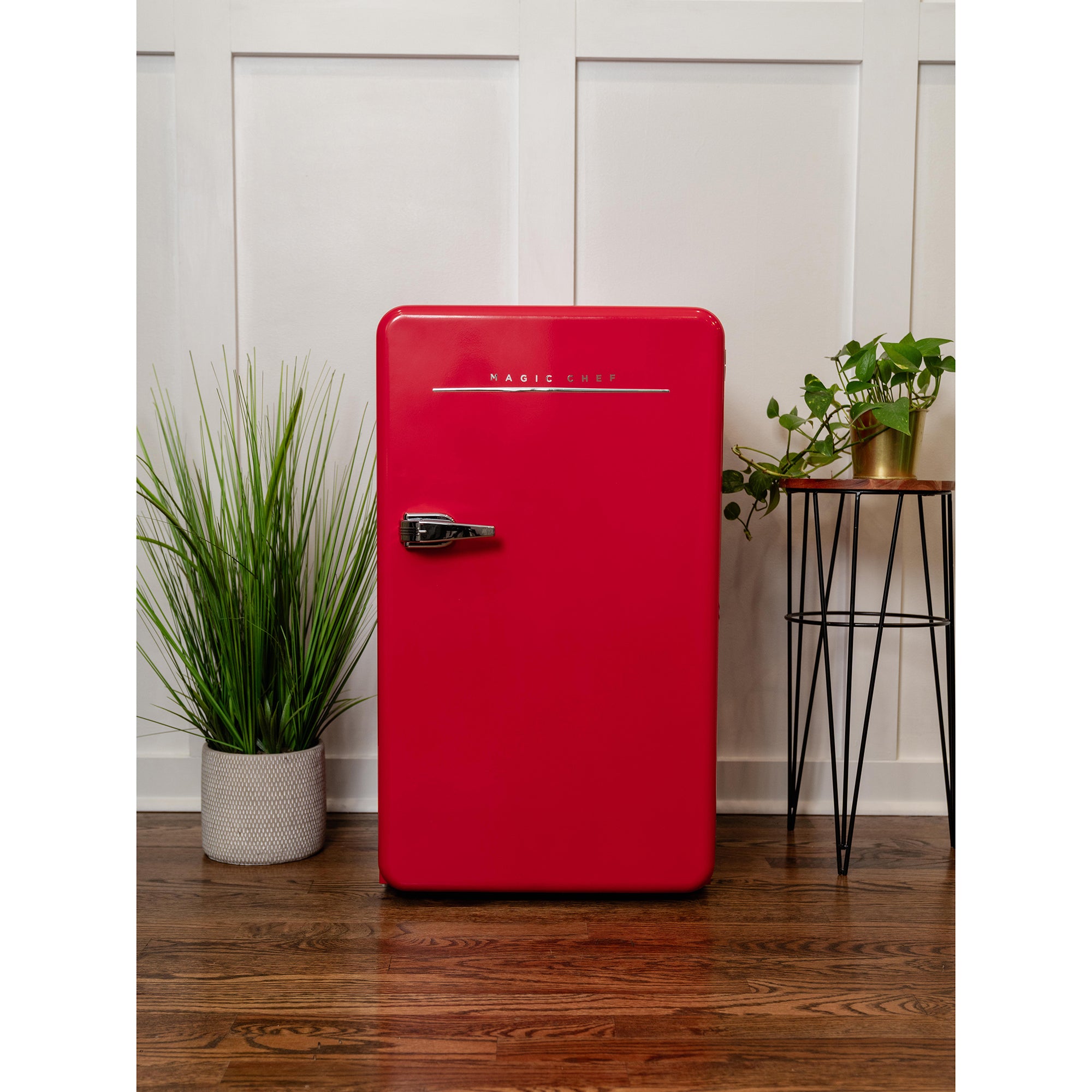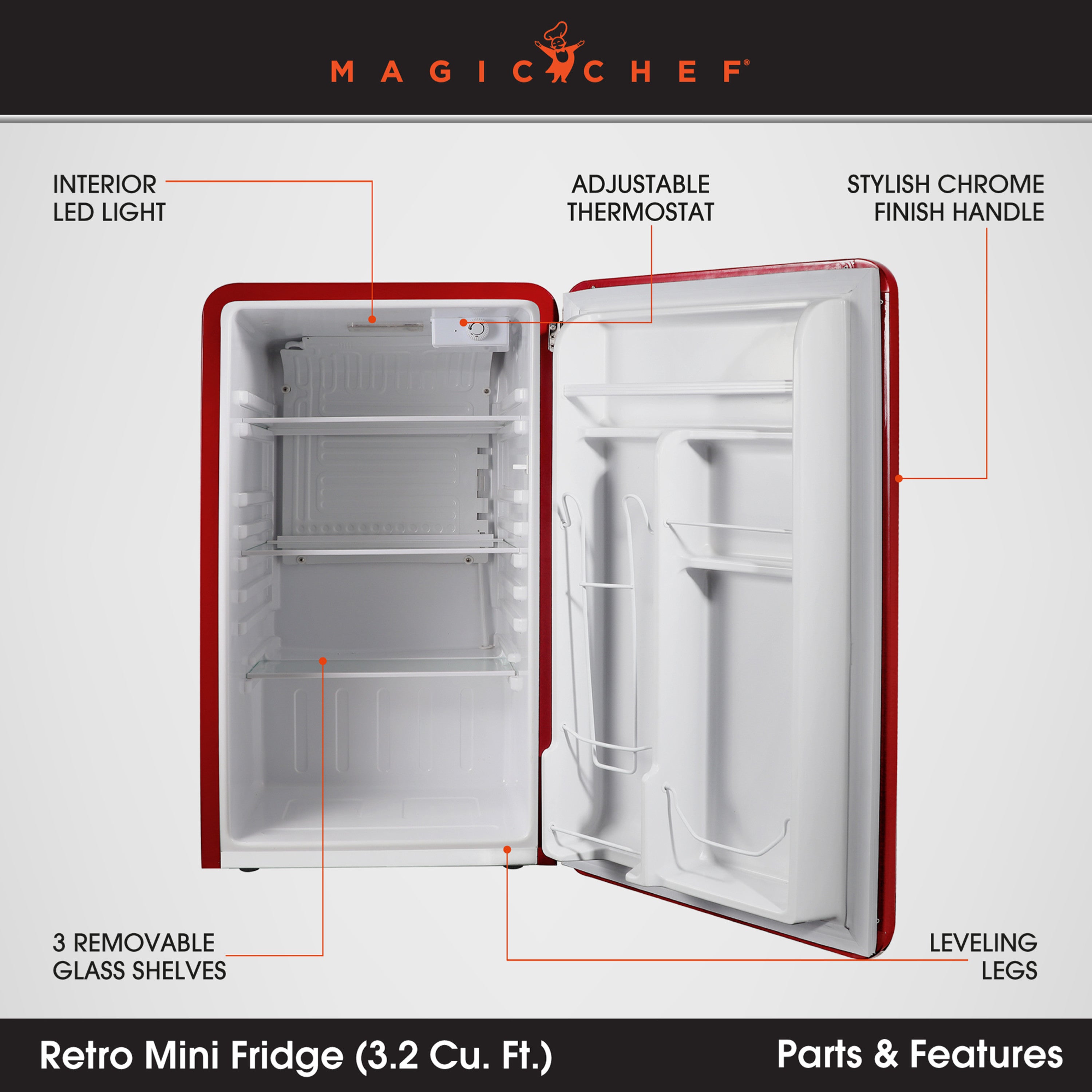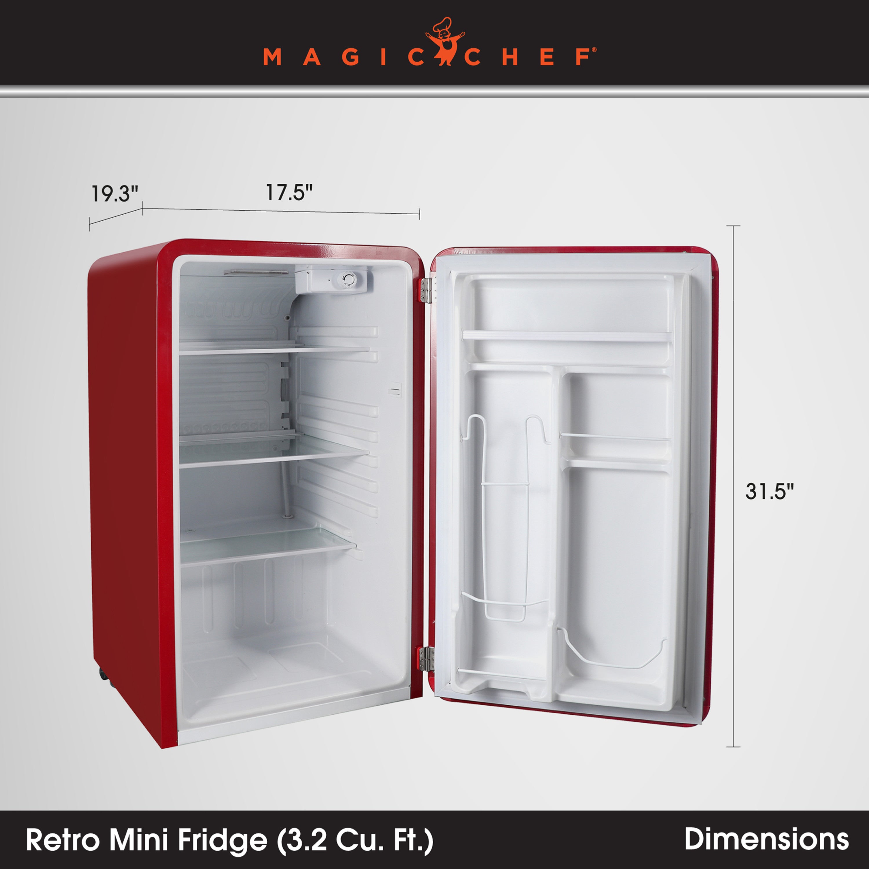 The Magic Chef 3.2 cu. ft. Retro Mini Fridge in red is a stylish addition to any dorm, office, rec room or kitchen. The all-refrigerator design features 3 adjustable glass shelves so you can modify the interior to suite your needs. The in-door storage racks are perfect for grab and go beverages, snacks and condiments and includes a can dispenser. An interior LED lights makes it easy to see what you have and an adjustable temperature control ensures the fridge is the perfect temperature. This compact refrigerator is Energy Star Certified and offers a 1-year parts and labor warranty and 5-year compressor part warranty.
