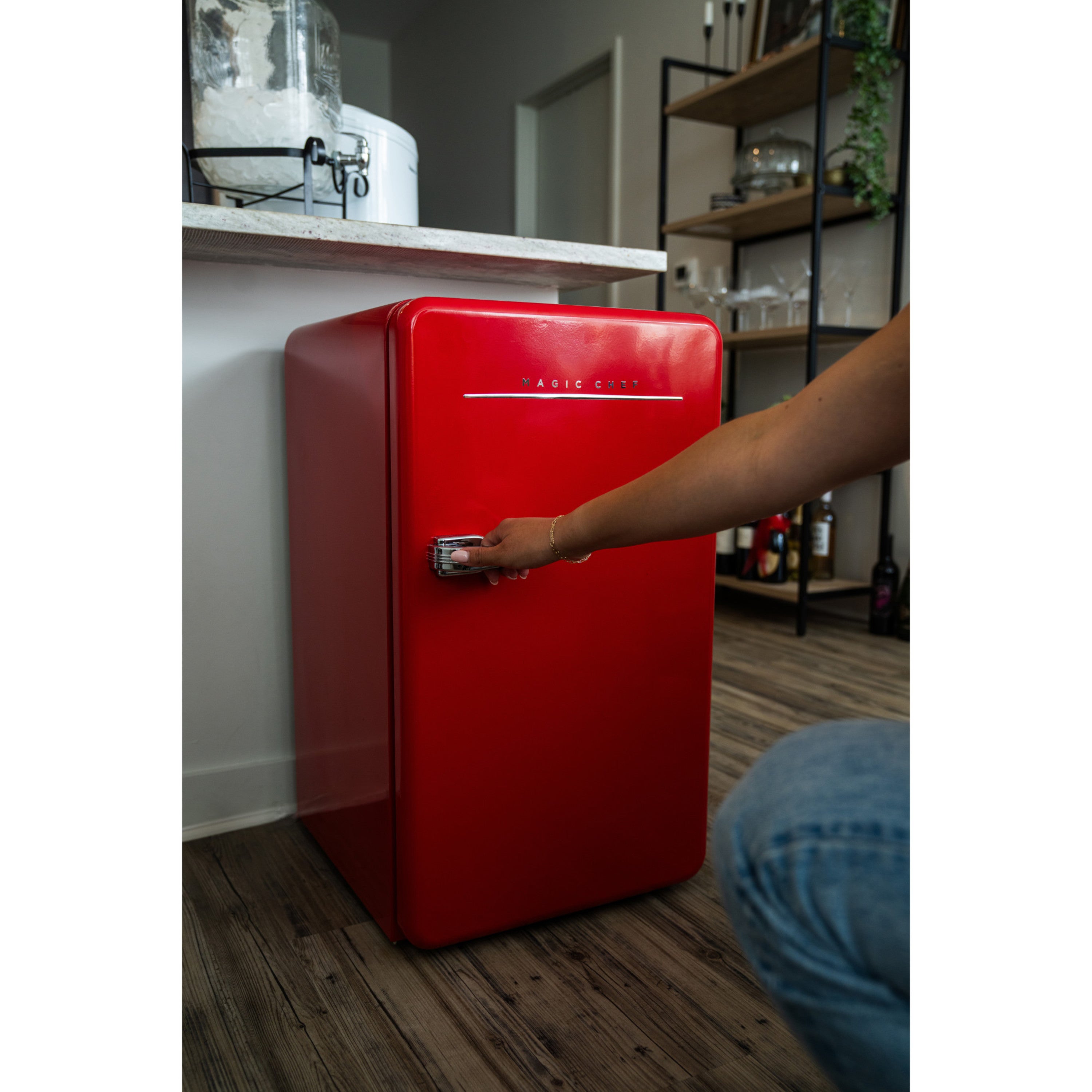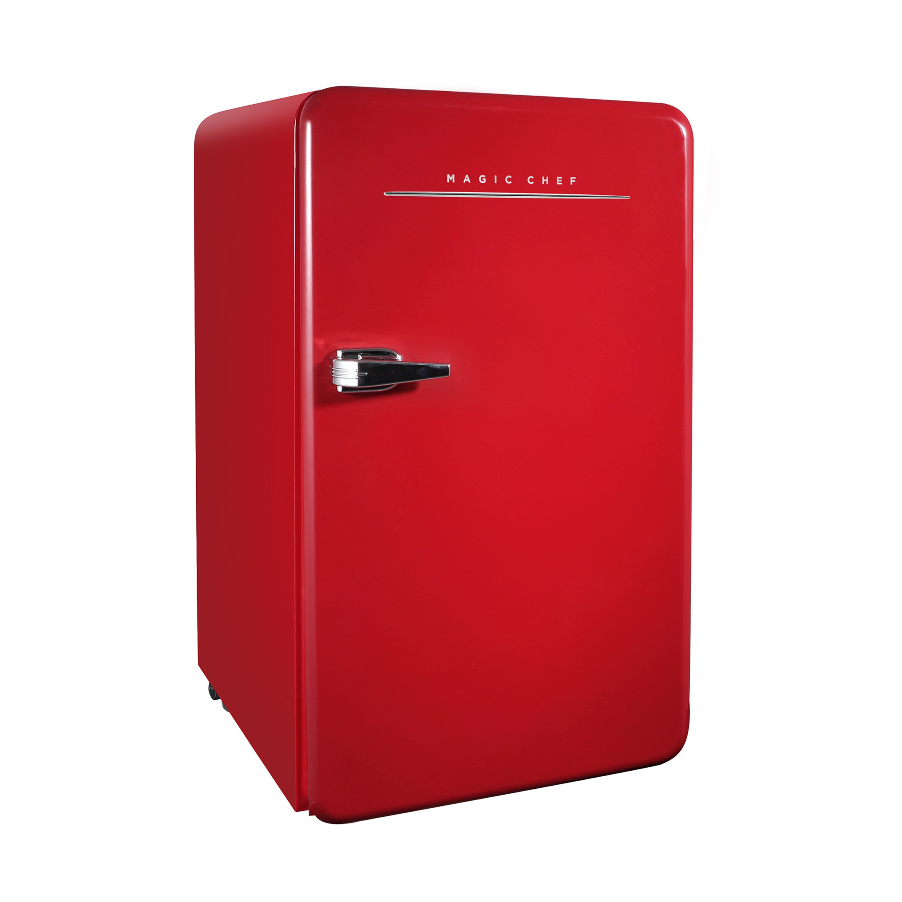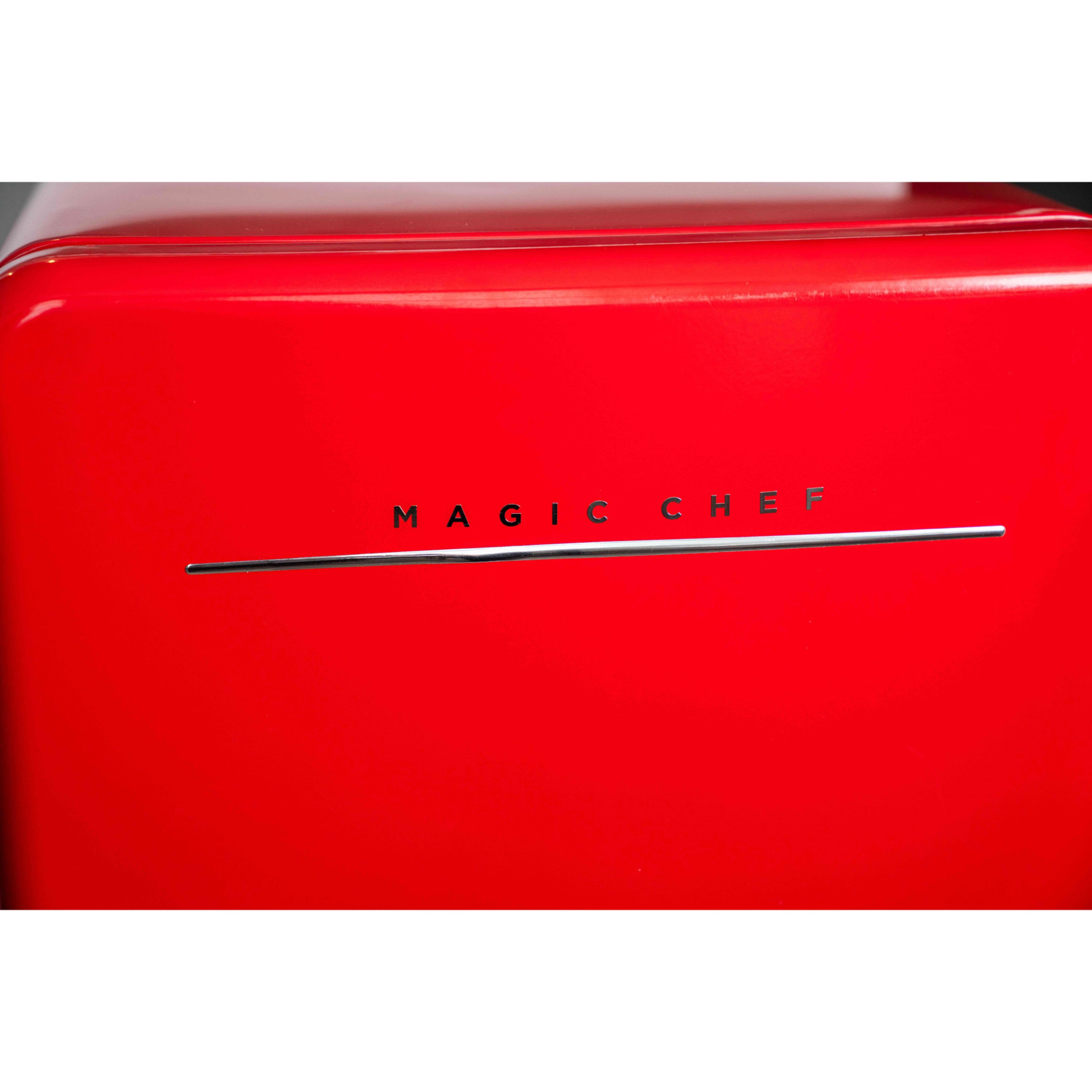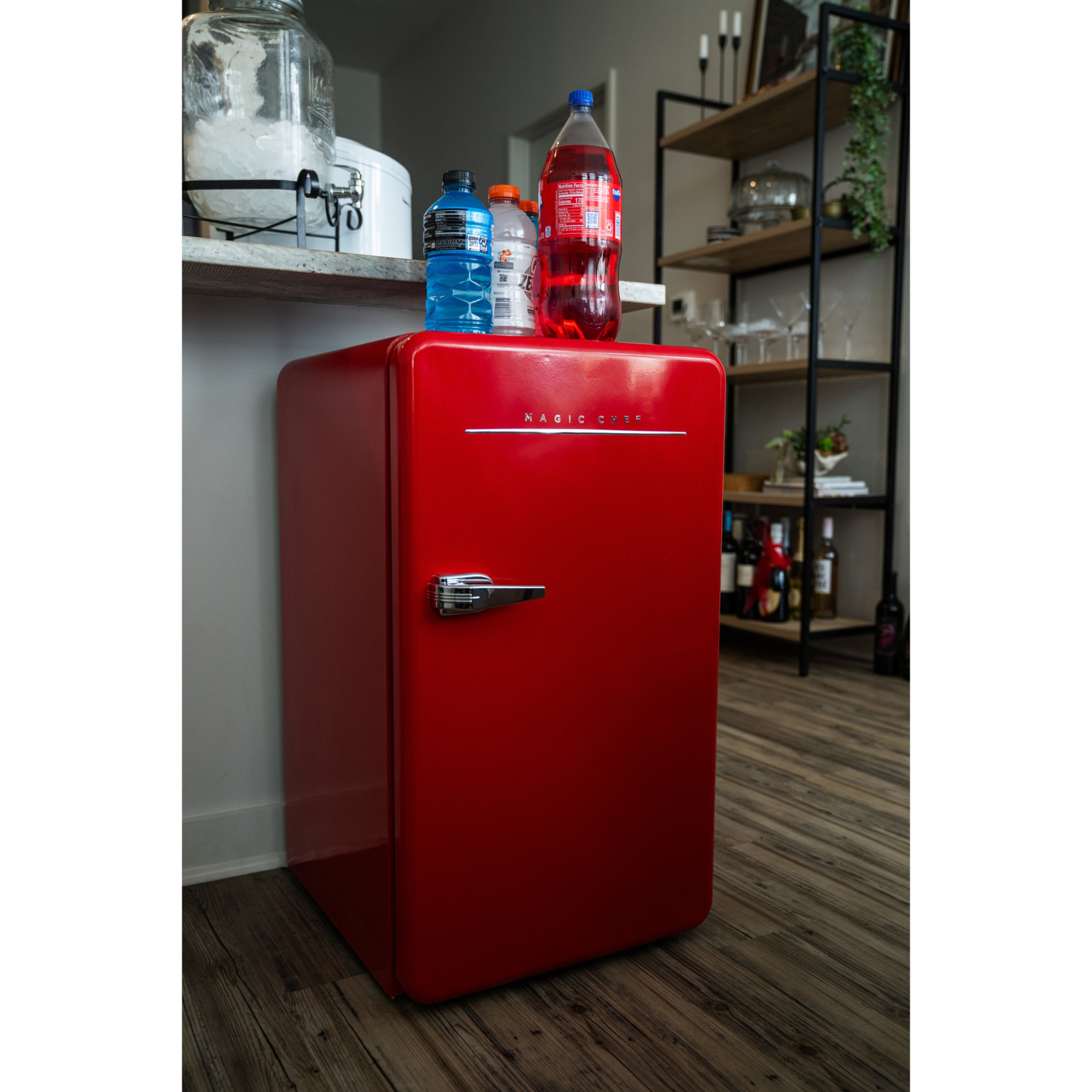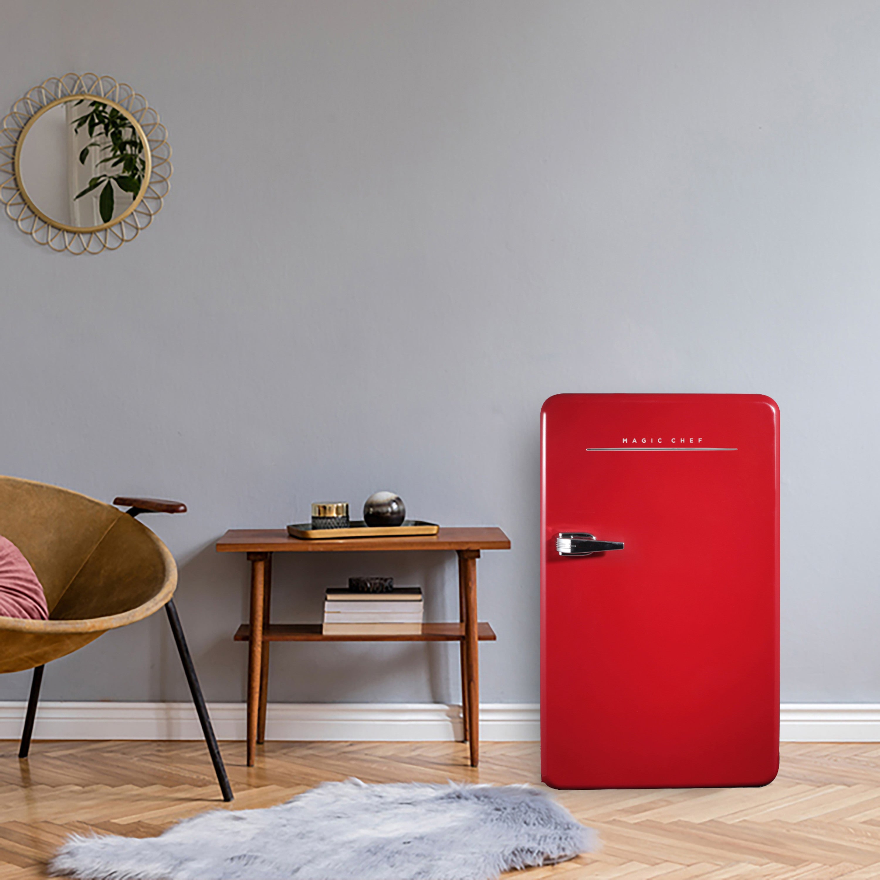 The Magic Chef 3.2 cu. ft. Retro Mini Fridge in red is a stylish addition to any dorm, office, rec room or kitchen. The all-refrigerator design features 3 adjustable glass shelves so you can modify the interior to suite your needs. The in-door storage racks are perfect for grab and go beverages, snacks and condiments and includes a can dispenser. An interior LED lights makes it easy to see what you have and an adjustable temperature control ensures the fridge is the perfect temperature. This compact refrigerator is Energy Star Certified and offers a 1-year parts and labor warranty and 5-year compressor part warranty.