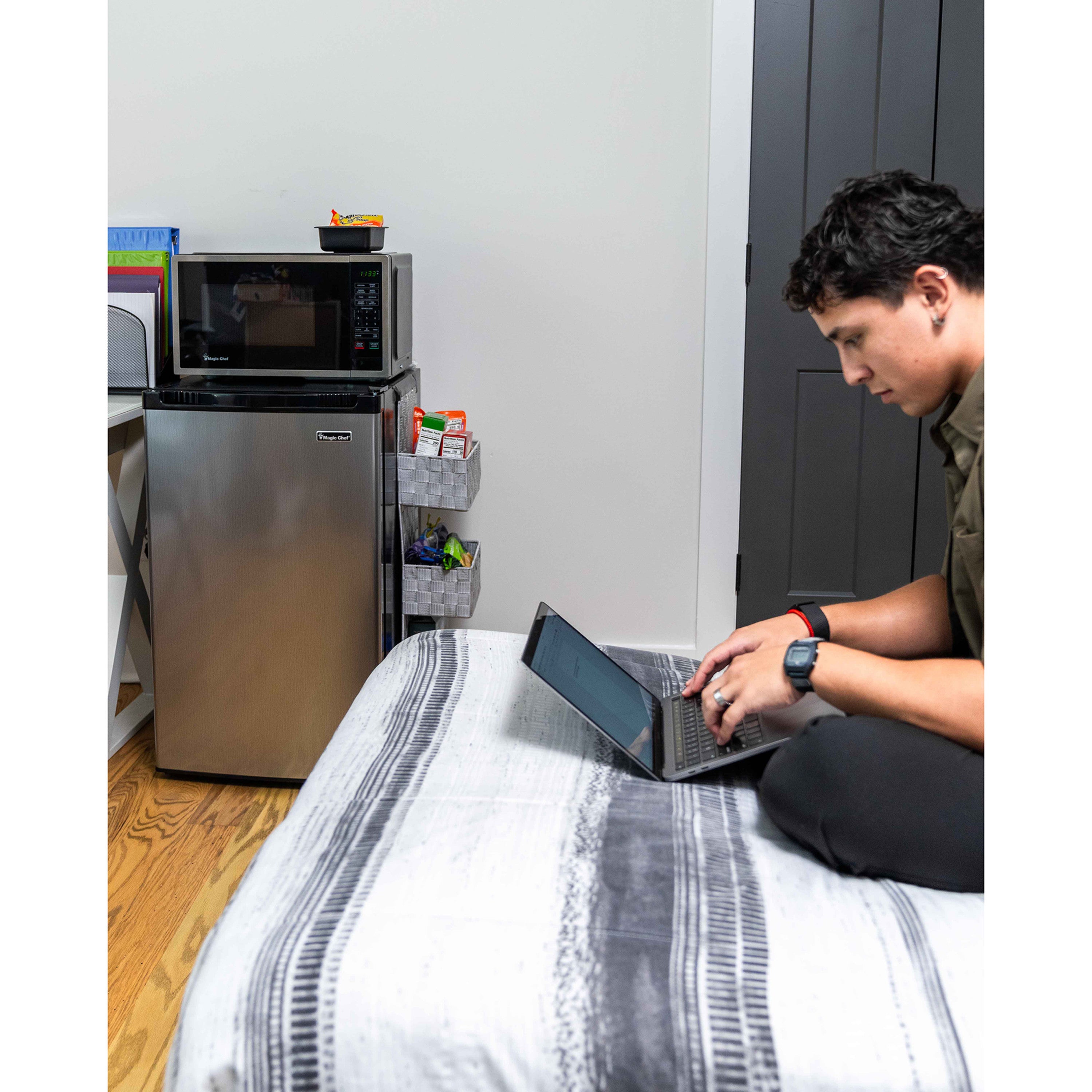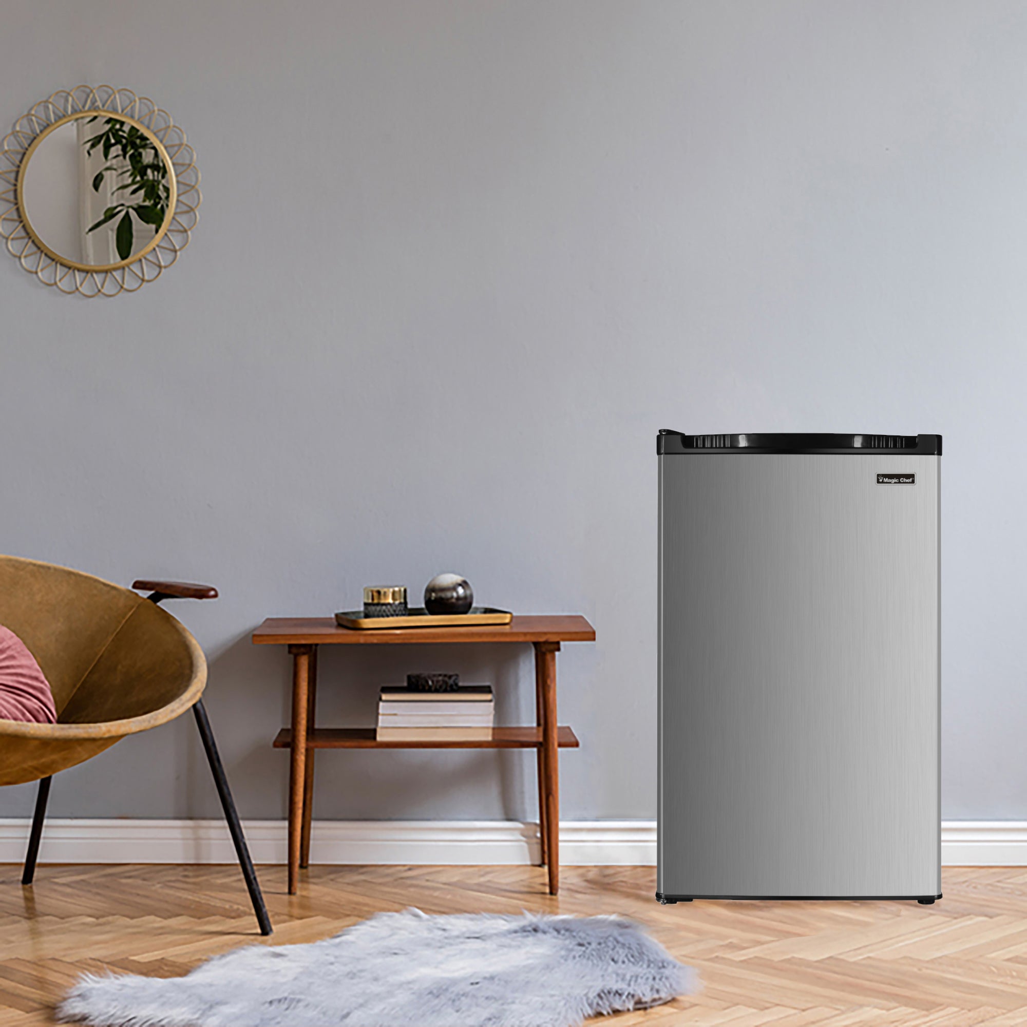 Keep your food fresh and cold with the Magic Chef MCR44SE 4.4 Cubic-ft. Refrigerator. It is good for storing food in a compact space. You can use this Magic Chef refrigerator in offices, dorm rooms and more. It fits into smaller spaces with ease, making it convenient to store food and drinks wherever is needed. This stainless-looking compact refrigerator features an in-door gallon rack and a can rack that provides plenty of beverage storage. There is an adjustable glass shelving rack. With an adjustable thermostat control and manual defrost, you control the temperature and freshness of your food. The Magic Chef MCR44SE 4.4 Cubic-ft. Refrigerator will quickly become indispensable in your home or office.