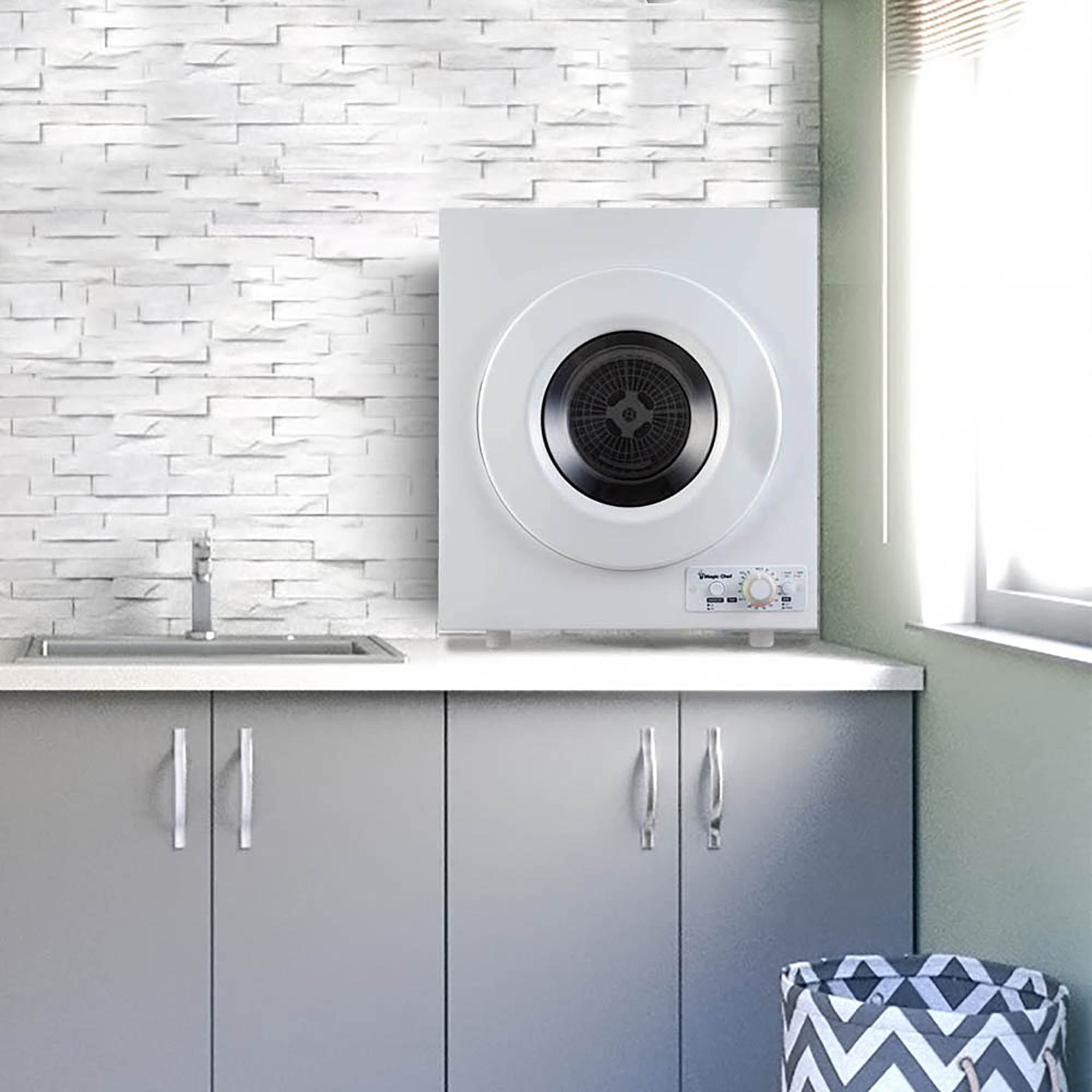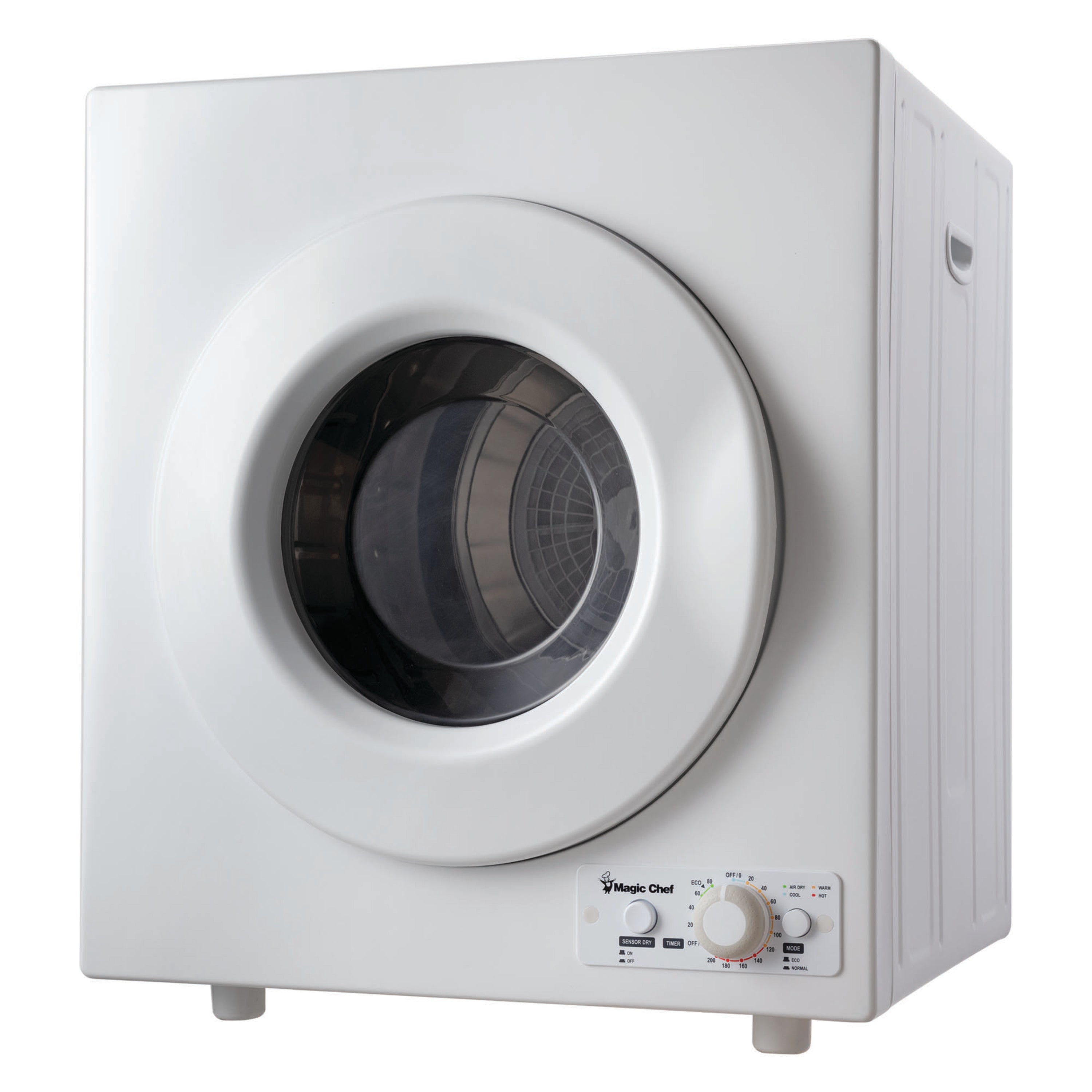 The Magic Chef 3.5 cu. ft. Compact Dryer in White with Mechanical Controls is perfect for apartments, condos, vacation homes, dorms or even RVs. To save space, you can place the dryer on a countertop, the floor or you can wall-mount it. The see-through window lets you monitor your clothes while they're drying and adjustable leveling legs keep things steady.
