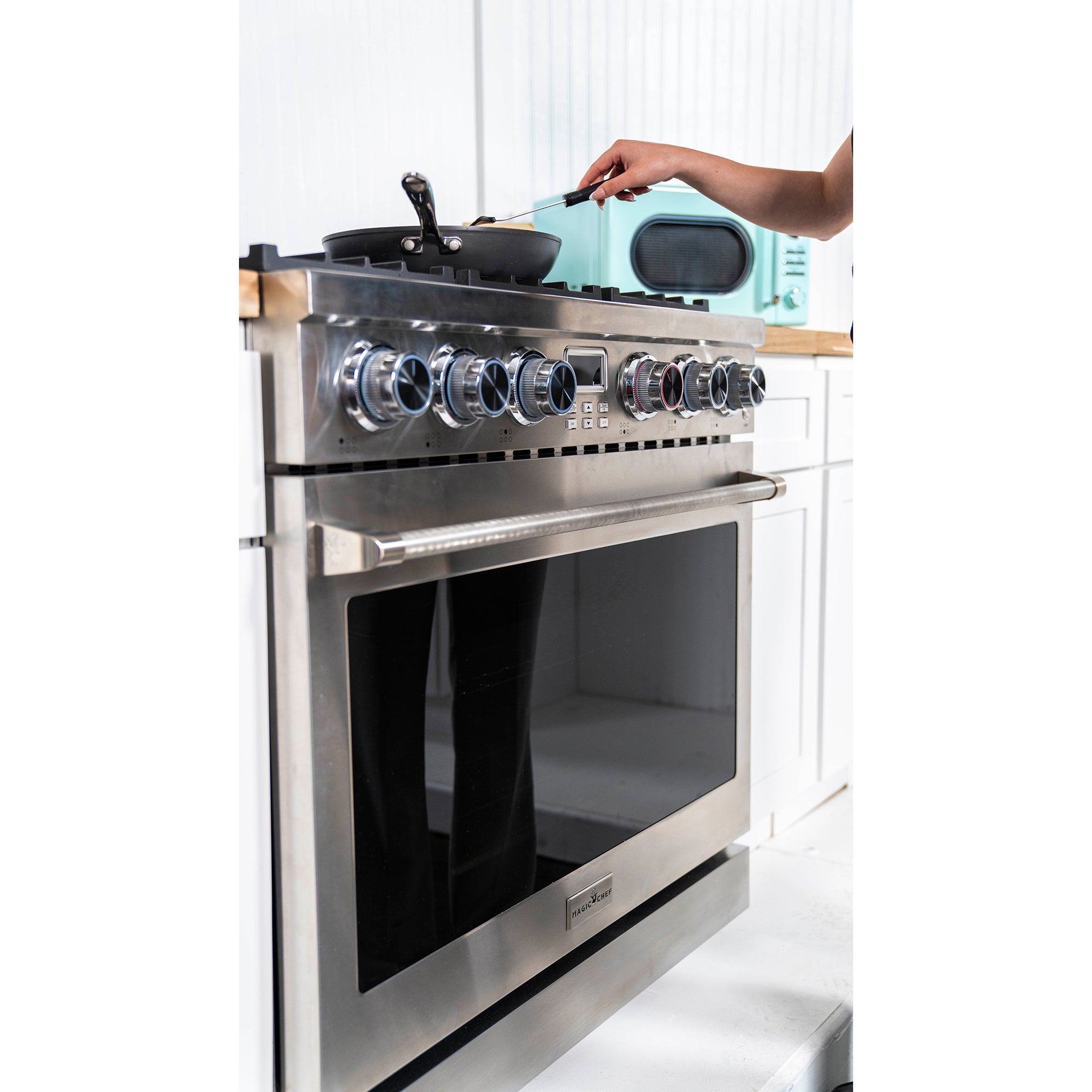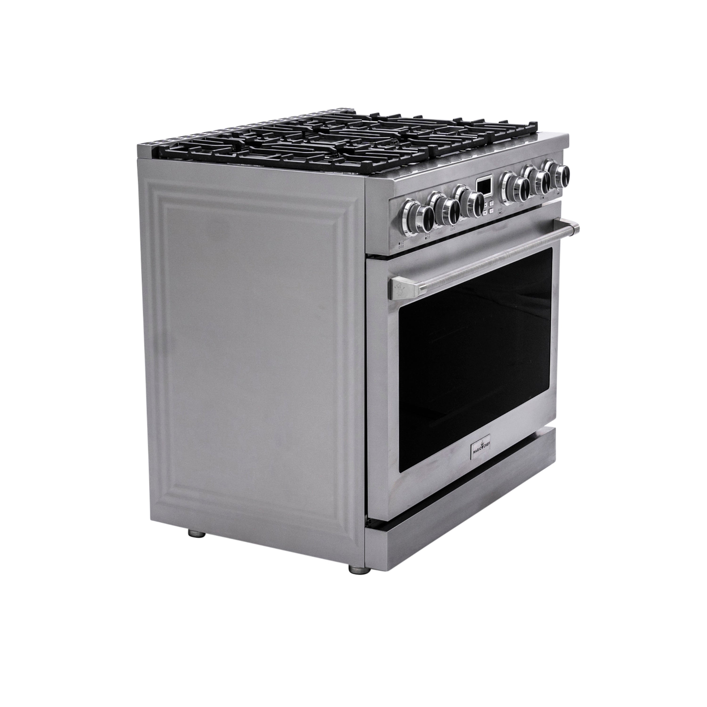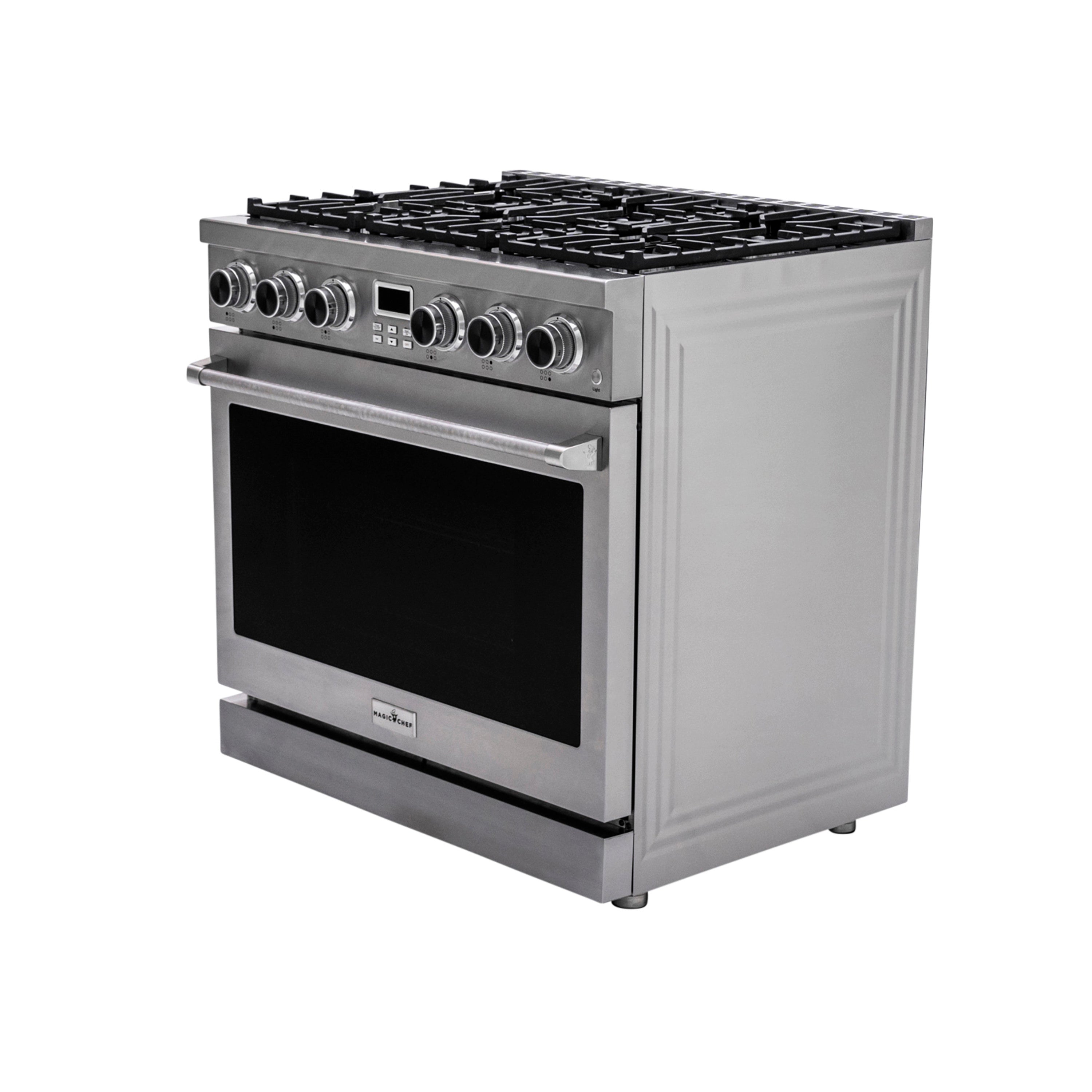 Bring Magic back into your kitchen and experience culinary excellence with the introduction of Magic Chef's 36 in. Pro Style Freestanding Gas Range. It is designed for reliable performance, versatility, and safety. Crafted with durable stainless steel, and a triple-layered glass window, it features continuous cast iron grates and ergonomically designed controls. The control knobs remain lit red, when in use. (no second guessing if burners have been turned off- a safety benefit). For precision cooking it is enhanced by a convection oven and 6 high output sealed burners offering professional-grade BTU cooking performance. 6.0 cu. ft. capacity oven with adjustable racks and a telescoping rack, provides for easy accessibility Plus, with customizable door colors, it is the perfect blend of style and functionality for any kitchen.