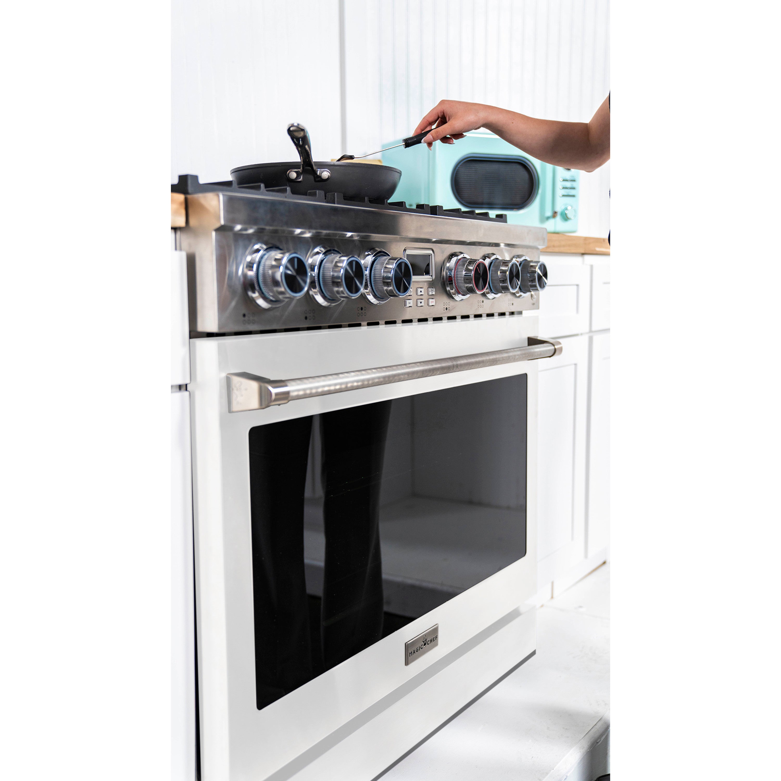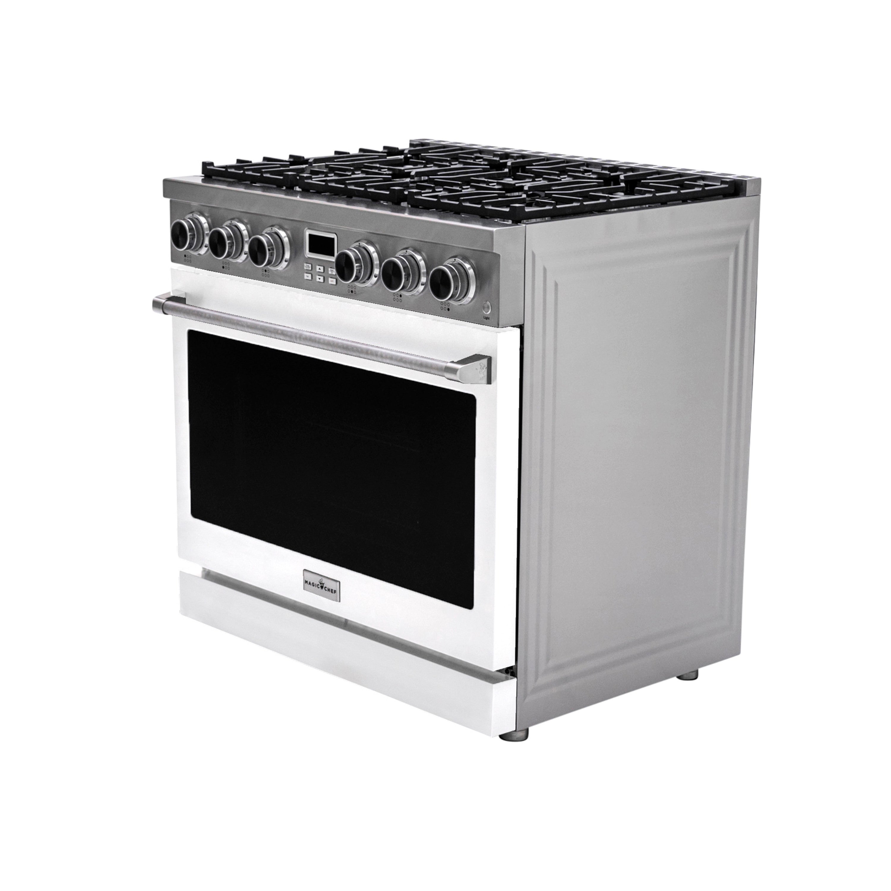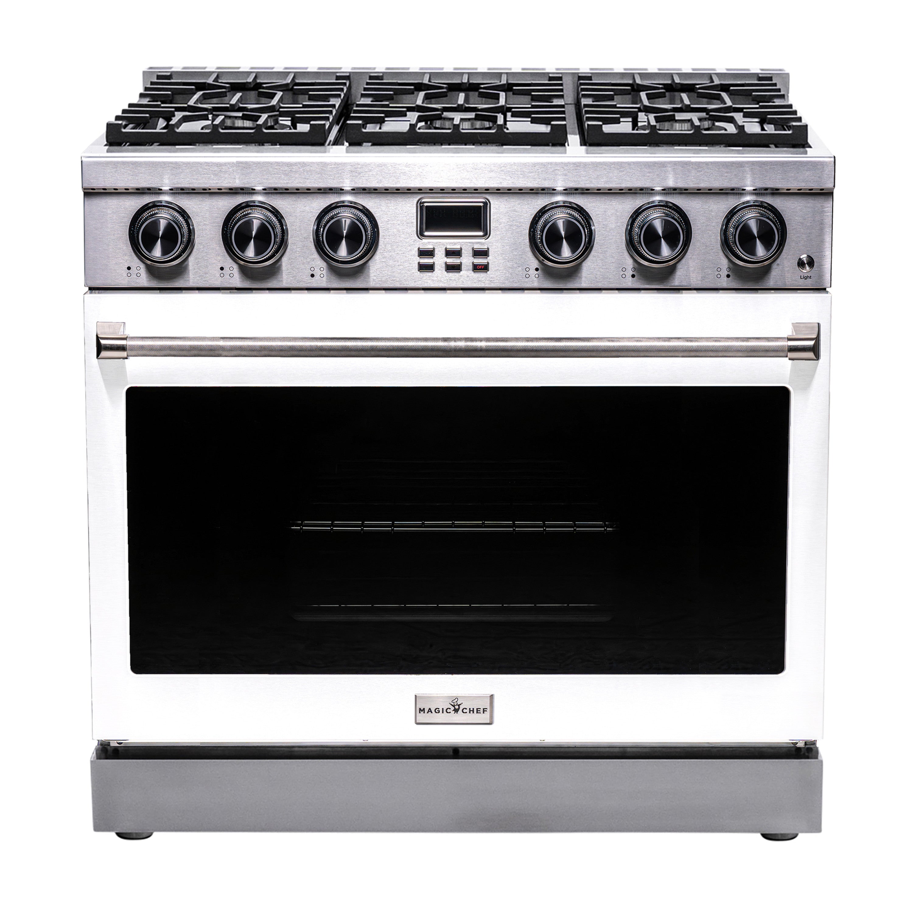 Bring Magic back into your kitchen and experience culinary excellence with the introduction of Magic Chef's 36 in. Pro Style Freestanding Gas Range. It is designed for reliable performance, versatility, and safety. Crafted with durable stainless steel, and a triple-layered glass window, it features continuous cast iron grates and ergonomically designed controls. The control knobs remain lit red, when in use. (no second guessing if burners have been turned off- a safety benefit). For precision cooking it is enhanced by a convection oven and 6 high output sealed burners offering professional-grade BTU cooking performance. 6.0 cu. ft. capacity oven with adjustable racks and a telescoping rack, provides for easy accessibility Plus, with customizable door colors, it is the perfect blend of style and functionality for any kitchen.