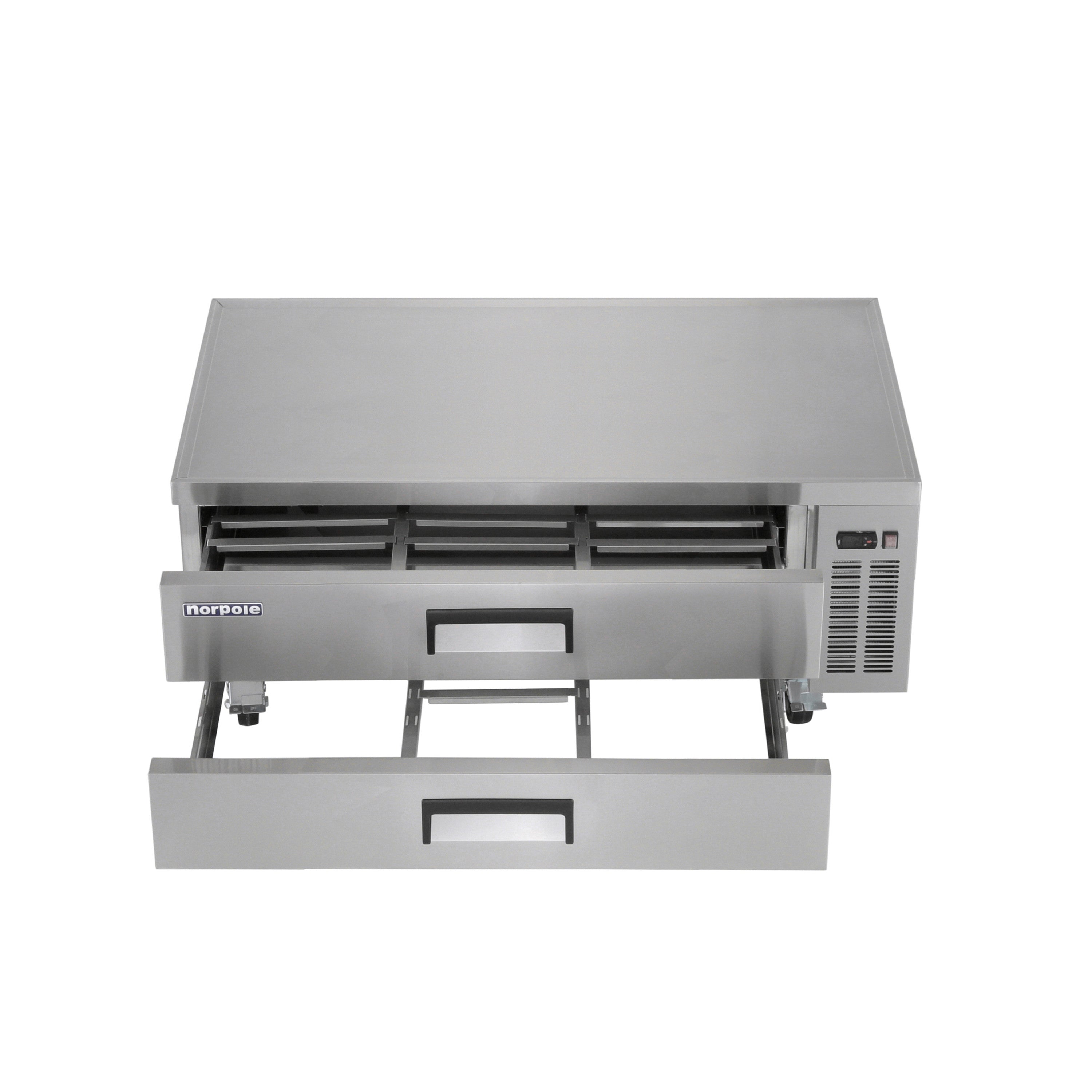 Optimize your kitchen workspace with the NorPole 60" Chef Base Refrigerator, a durable and versatile solution for heavy-duty foodservice environments. With a stainless steel interior and exterior, this unit offers long-lasting performance and a polished, professional look. Its powerful digital controller maintains a consistent 33°F to 40°F temperature range, while the side-mounted compressor maximizes internal storage. Equipped with heavy-duty castor wheels and a plug-and-play design, this chef base is easy to install and reposition for ultimate flexibility in busy kitchens.